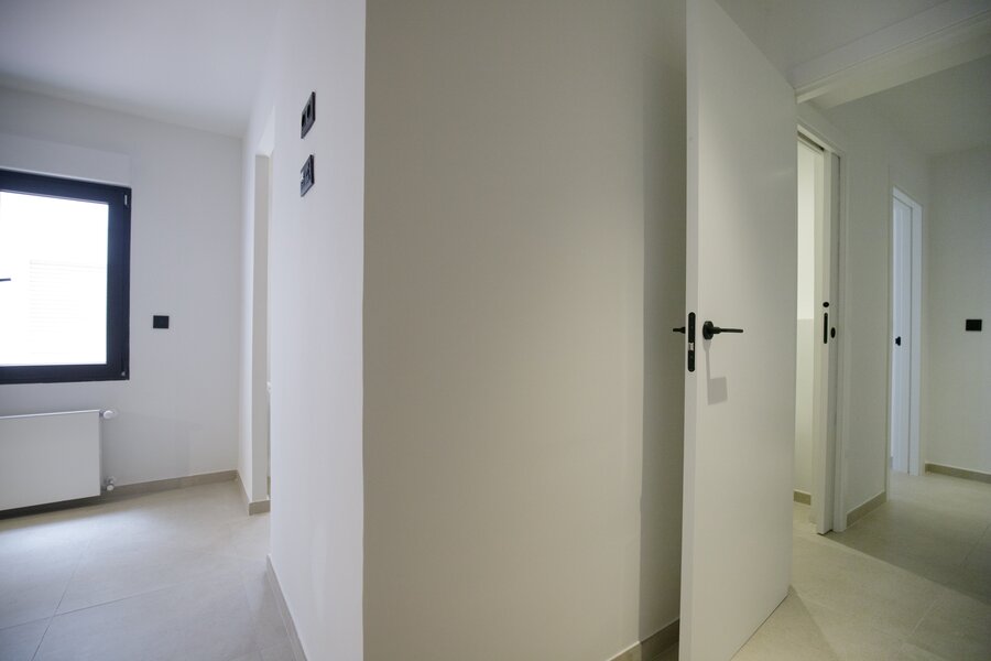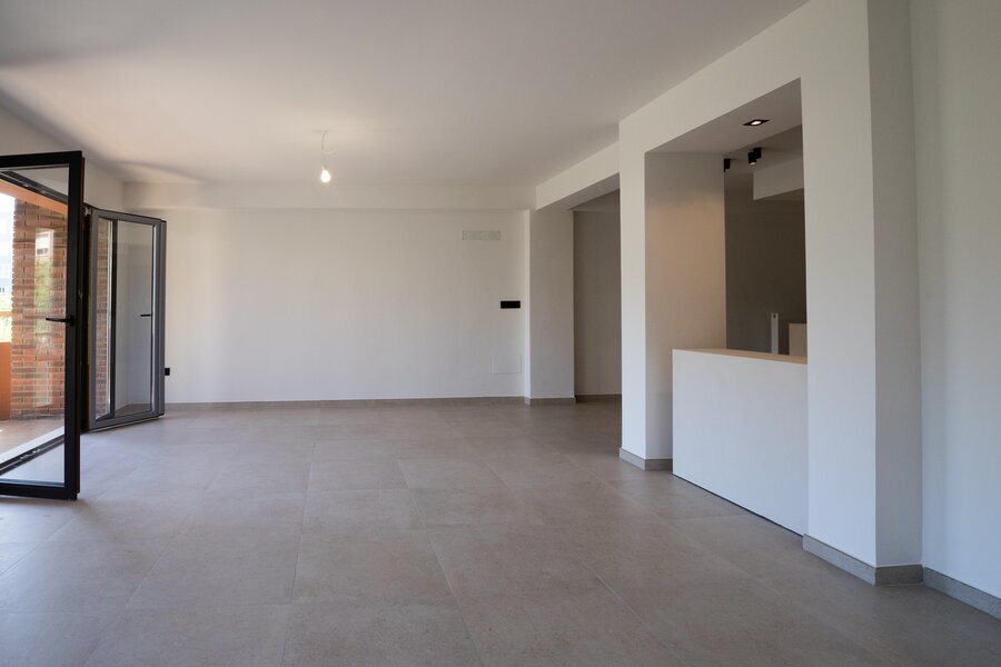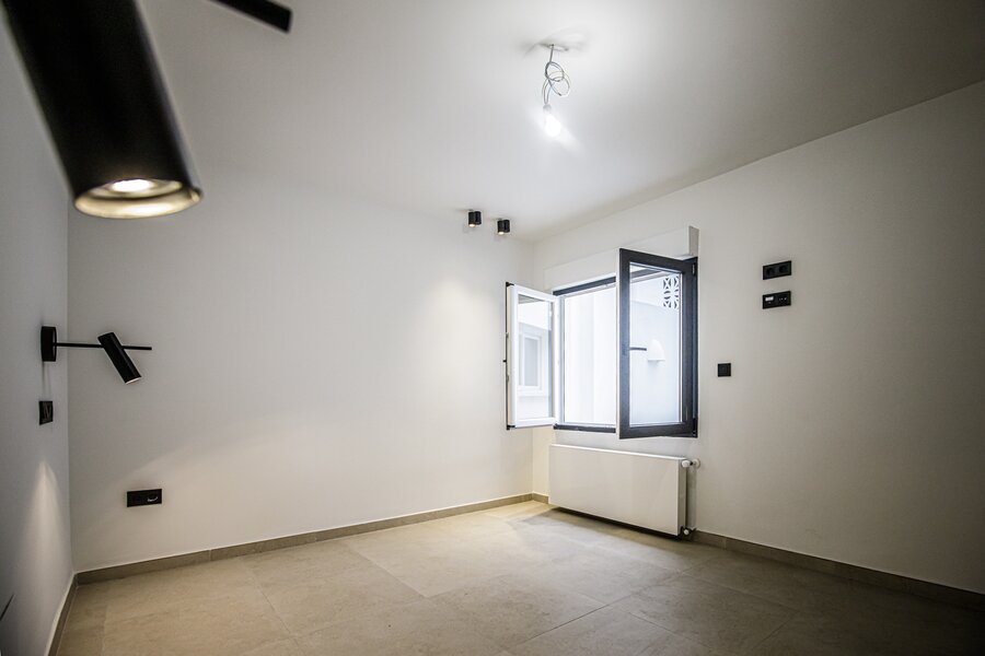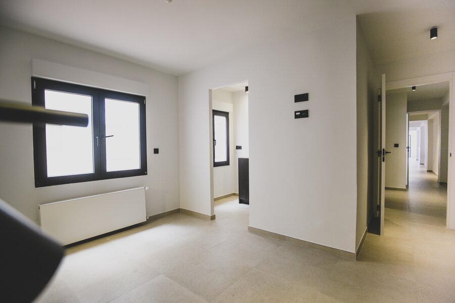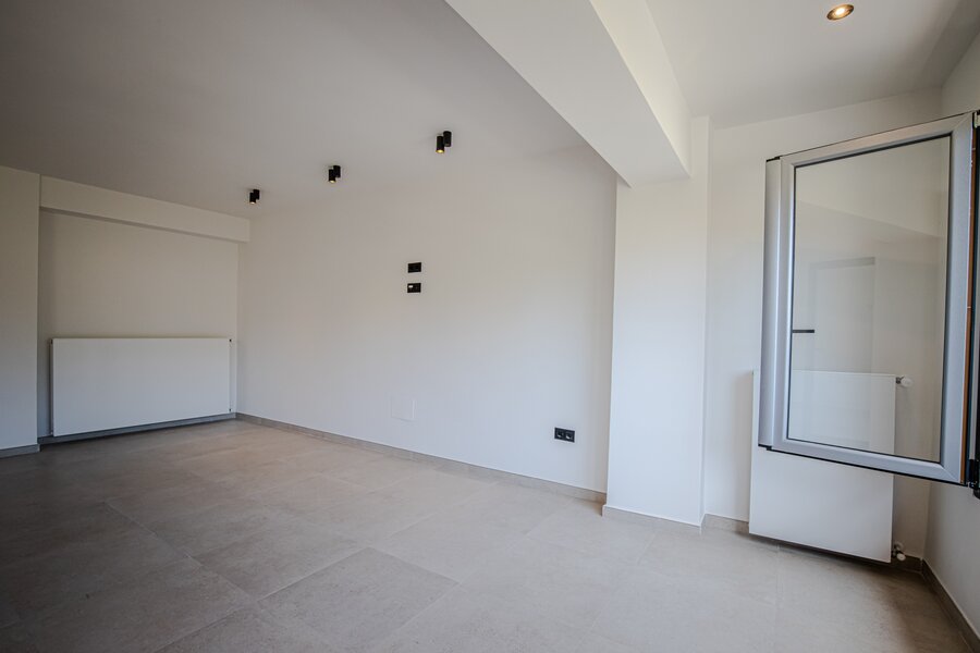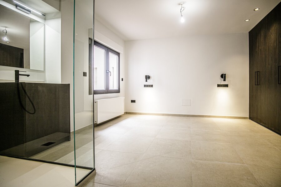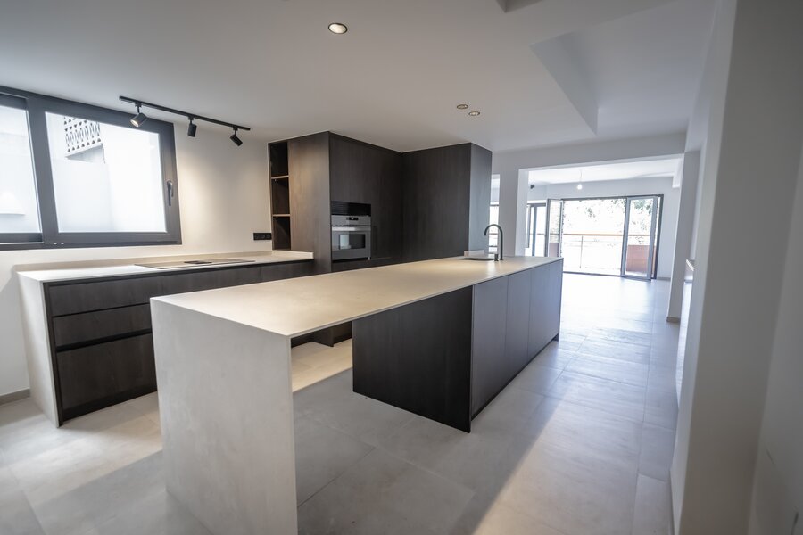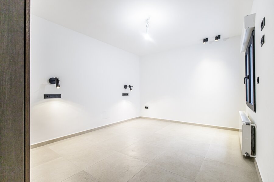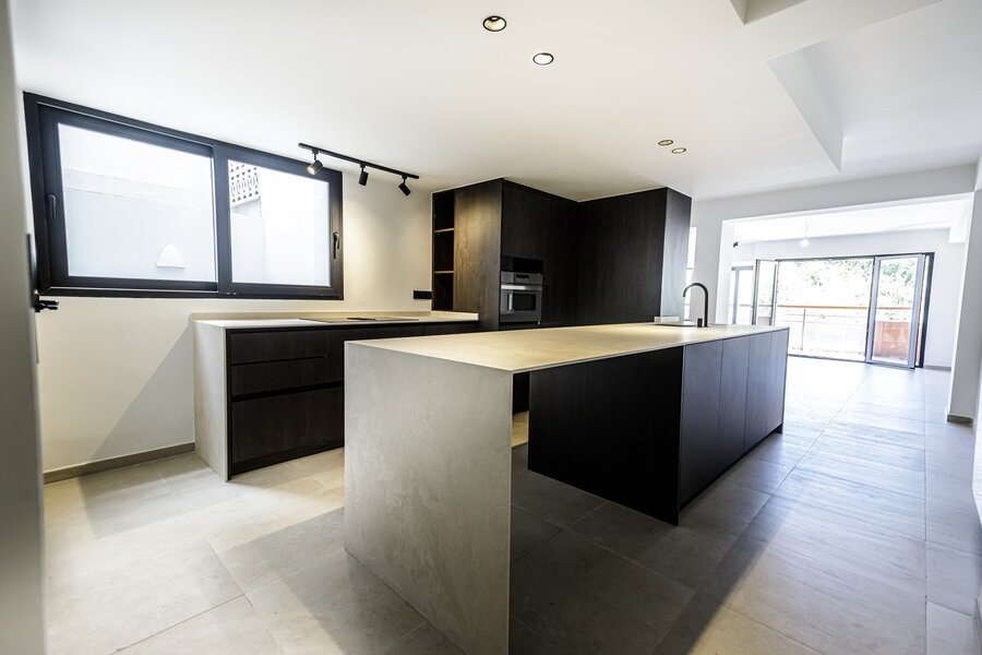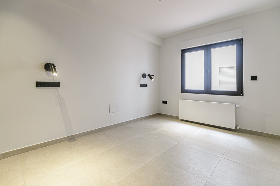 The living room is spacious and very bright and the open kitchen with bar is open to the living room. The furniture is made of dark wood, both in the kitchen and in the entrance hall. In the kitchen there is a room with space for a washing machine, another fridge or even storage. Another door from the kitchen leads to the inner courtyard of the house, which measures more than 10m2.