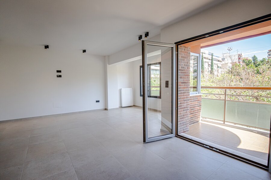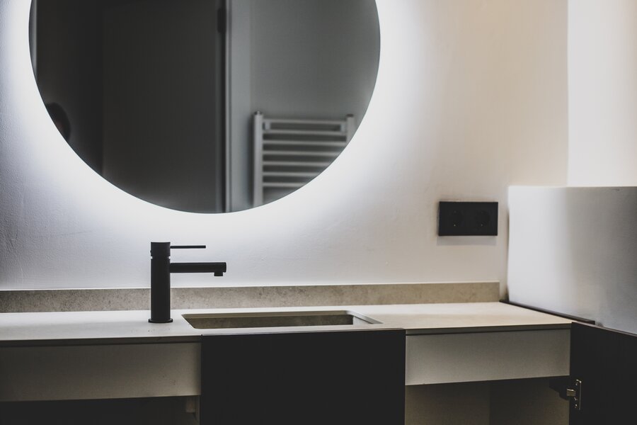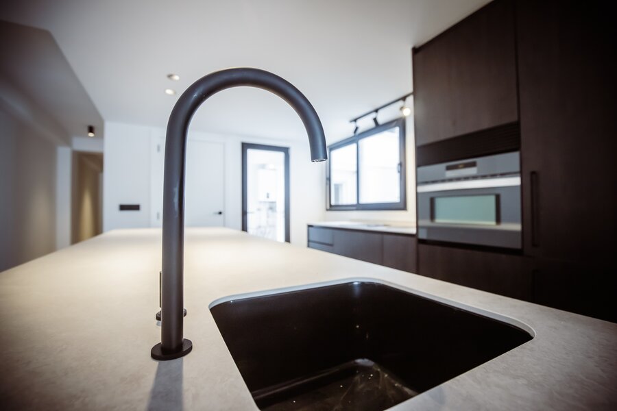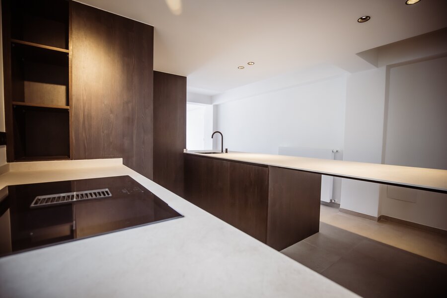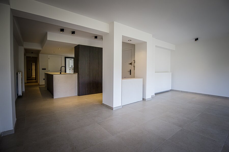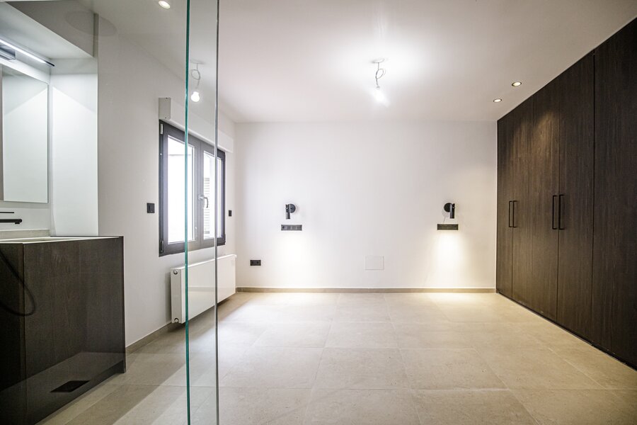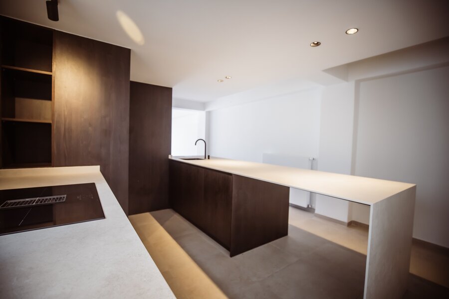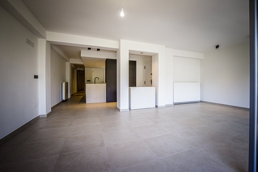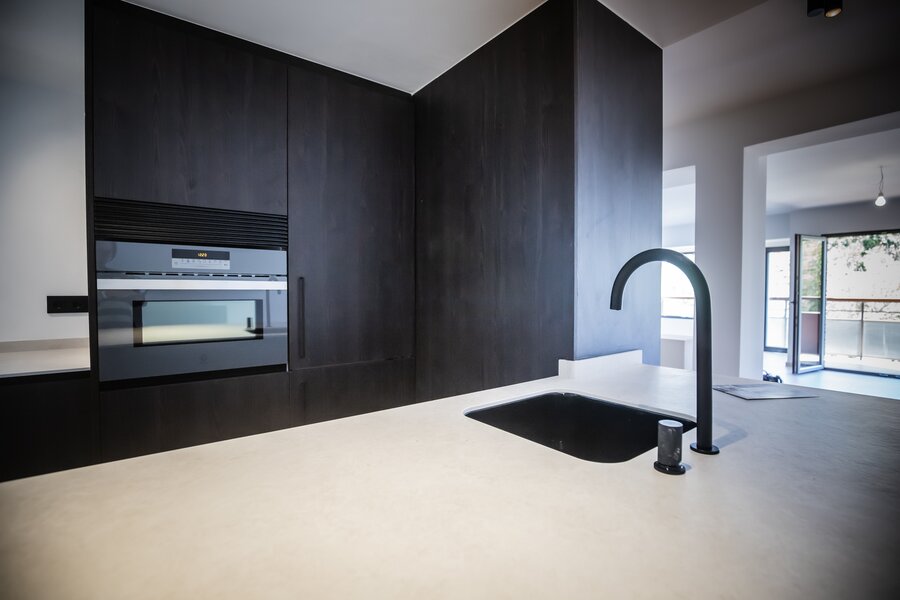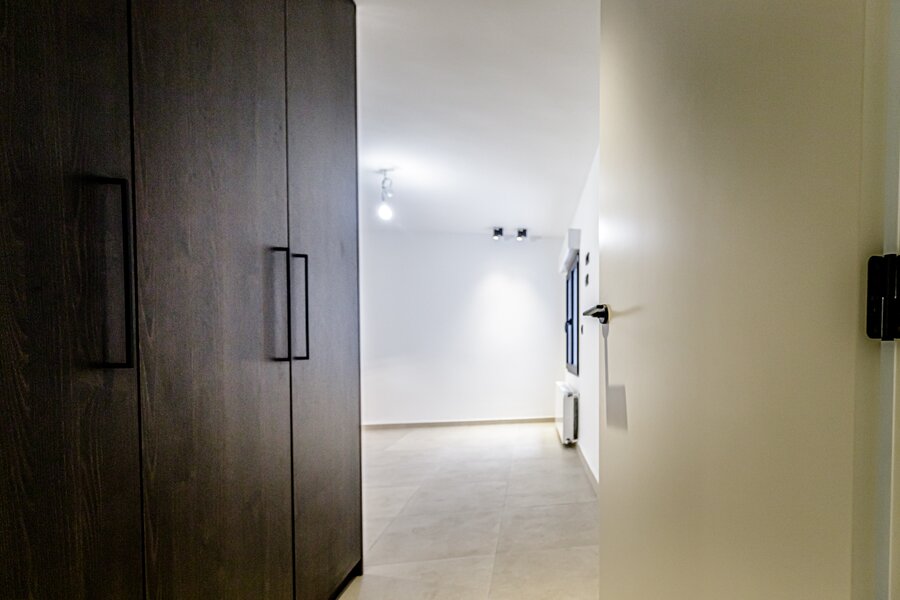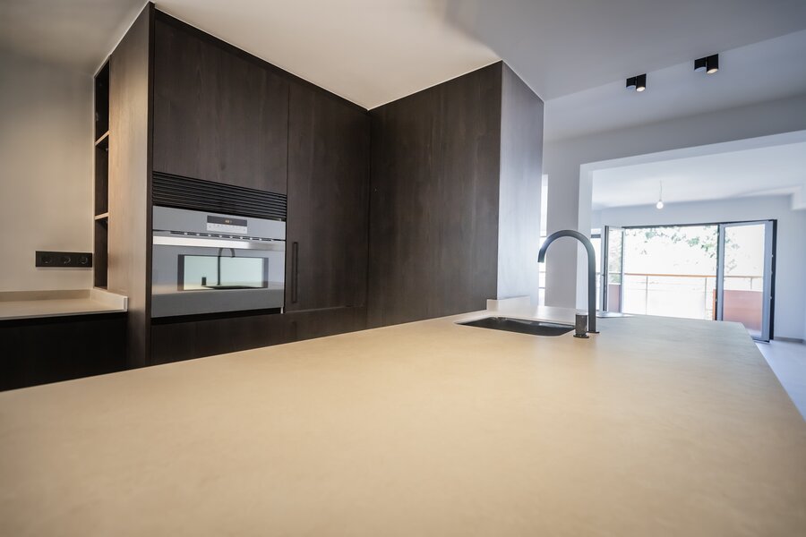The living room is spacious and very bright and the open kitchen with bar is open to the living room. The furniture is made of dark wood, both in the kitchen and in the entrance hall. In the kitchen there is a room with space for a washing machine, another fridge or even storage. Another door from the kitchen leads to the inner courtyard of the house, which measures more than 10m2.