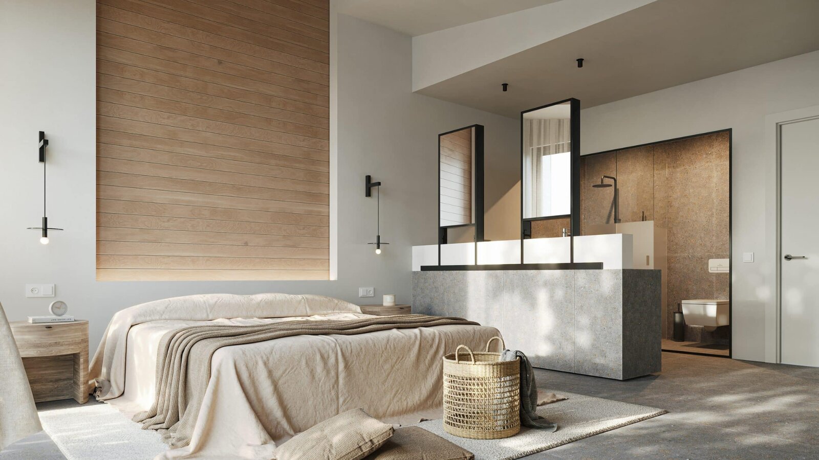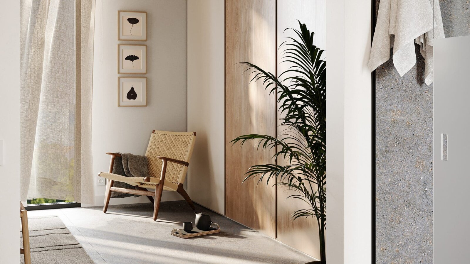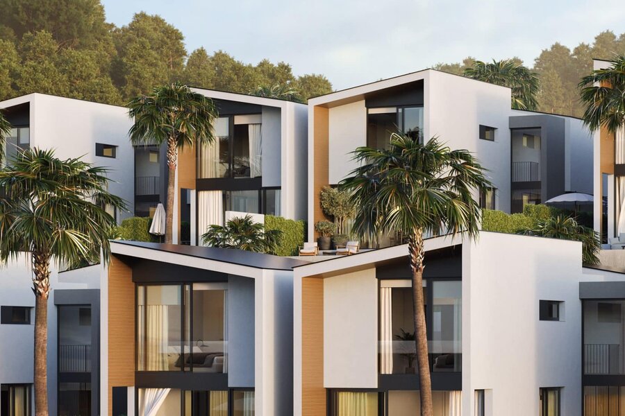 The villa’s interiors are bathed in natural light and warm materials, with a clever layout that includes a spacious open-plan living-dining room on the main floor and two ensuite bedrooms on the upper level, each with private terraces. On the lower floor, you’ll find a large private garage, storage room and multiuse space. Natural wood finishes, large-format tiling, and the sculptural staircase serve as architectural focal points that elevate the ambience. A variety of high-quality finishes and personalisation options ensure each home reflects the owner’s taste and lifestyle vision.