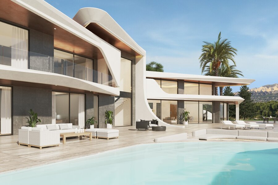 A truly spectacular villa with a stunning contemporary design that incorporates subtle curves in the façade, this architectural project has been designed for a 2,000 m2 plot. Designed with large windows that bring natural light to the house, you will enjoy constant views of the Mediterranean landscape, the Montgó mountain and the Mediterranean Sea.