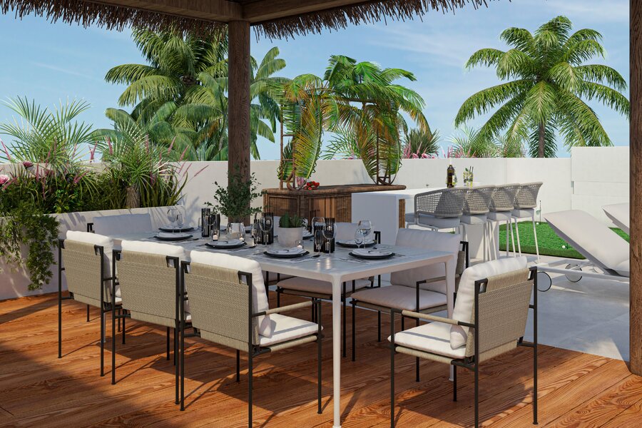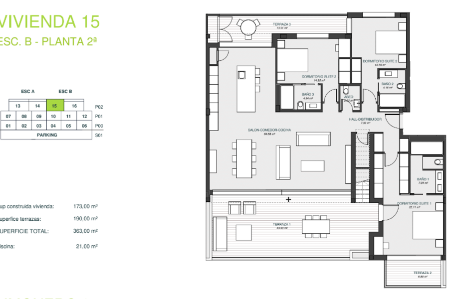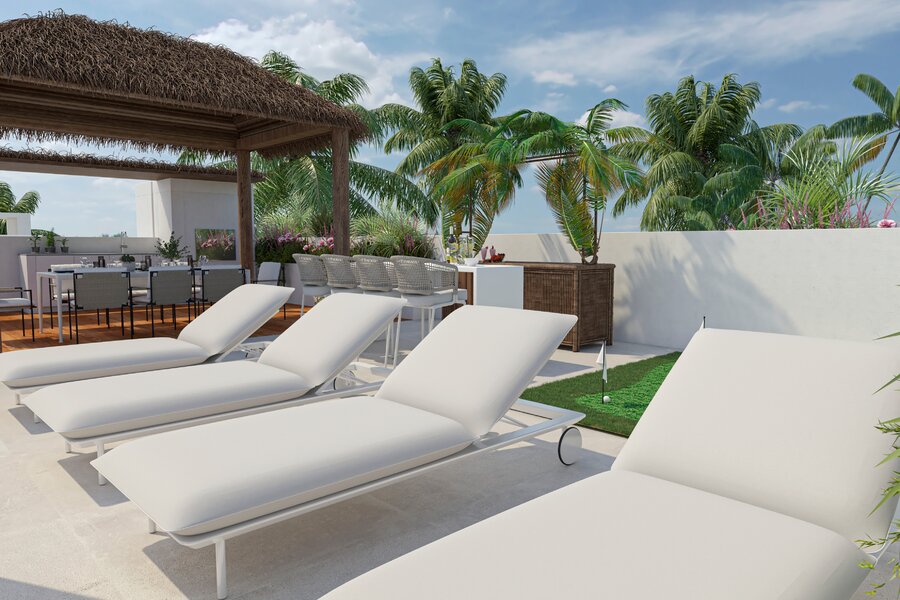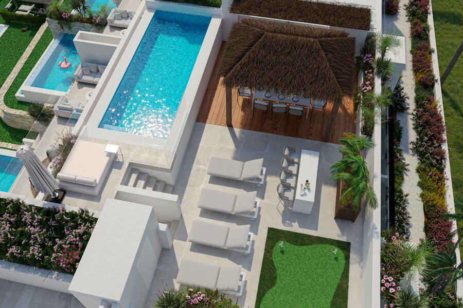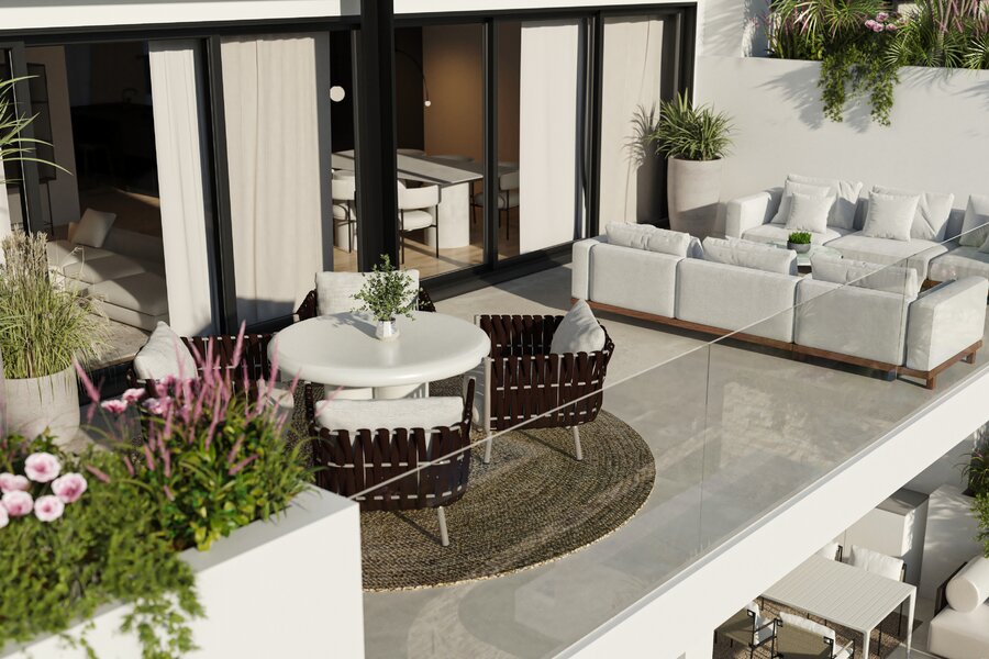 Newly built project of luxury flats at Las Colinas Golf & Country Club. All penthouses have a private pool. The 3-bedroom flats have double parking in the basement and a built-in wine room. The open-plan kitchen, dining room and living room benefit from natural light from the large windows to the south-facing terrace overlooking the communal area and green surroundings. Included in the flat is a parking space and a private storage room in the basement.