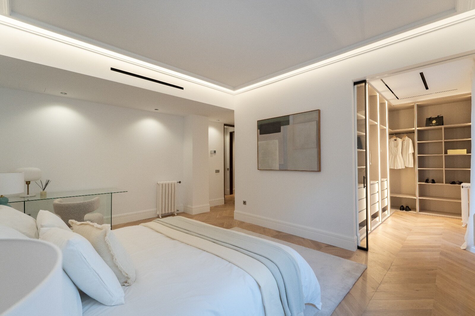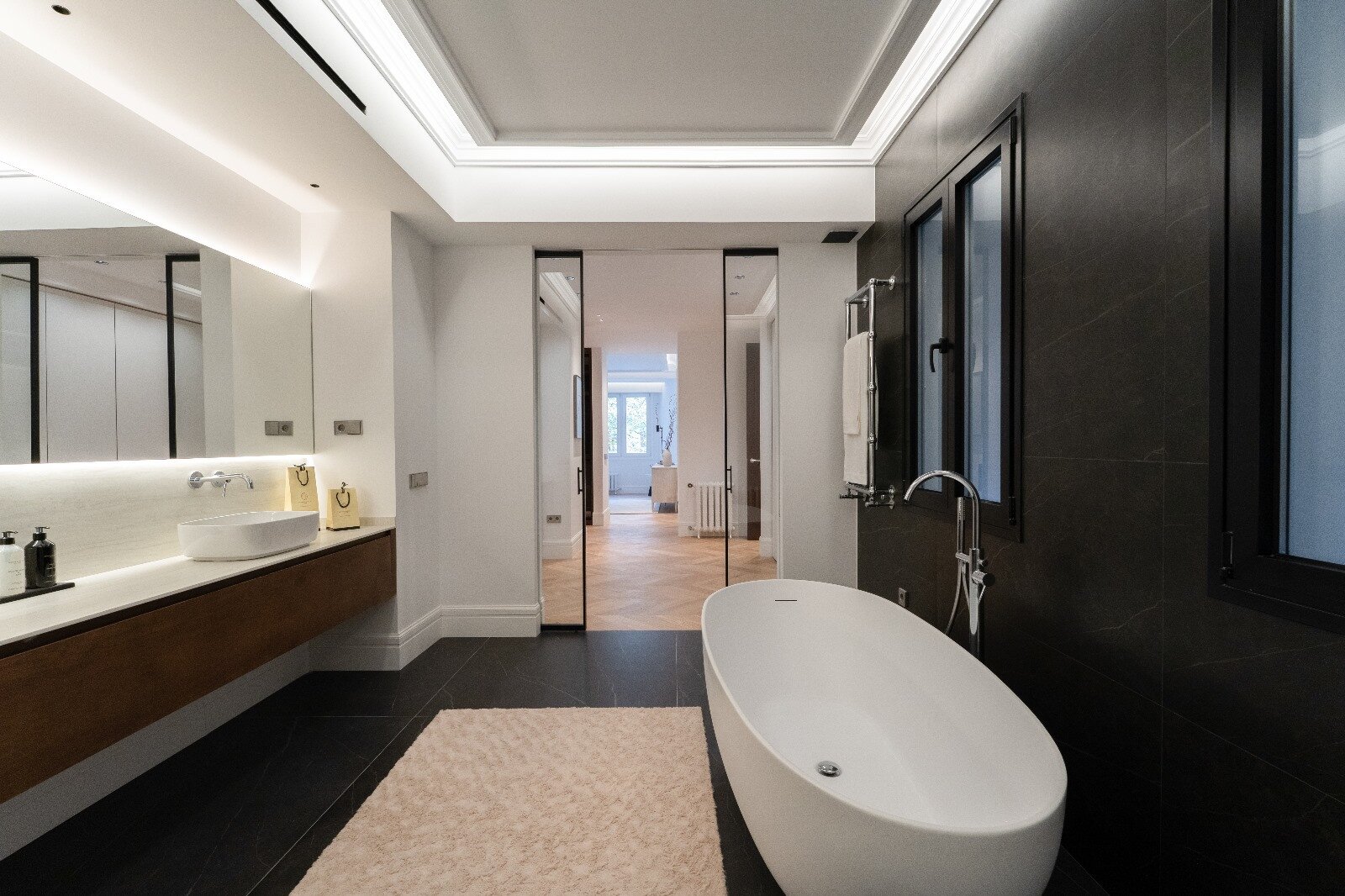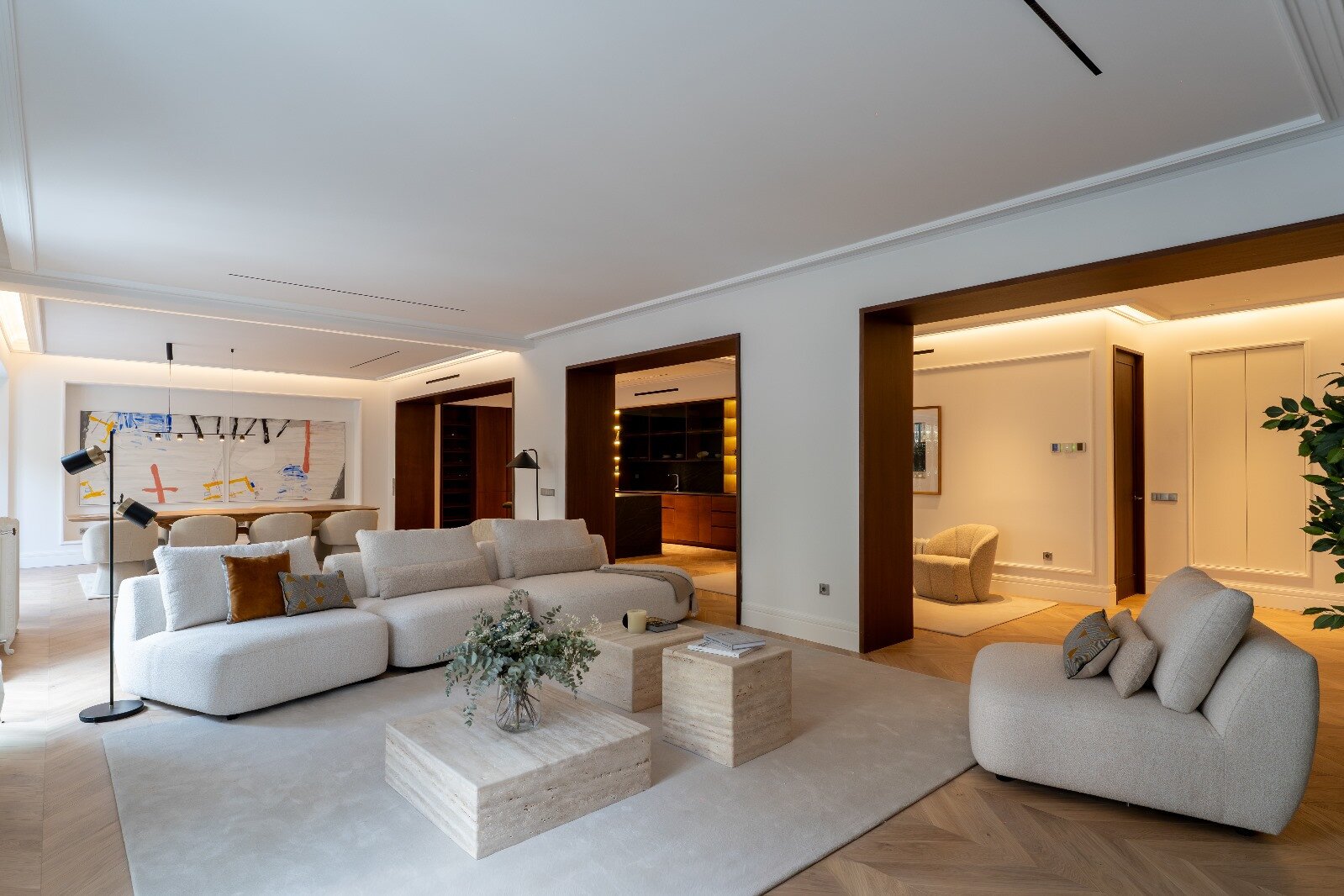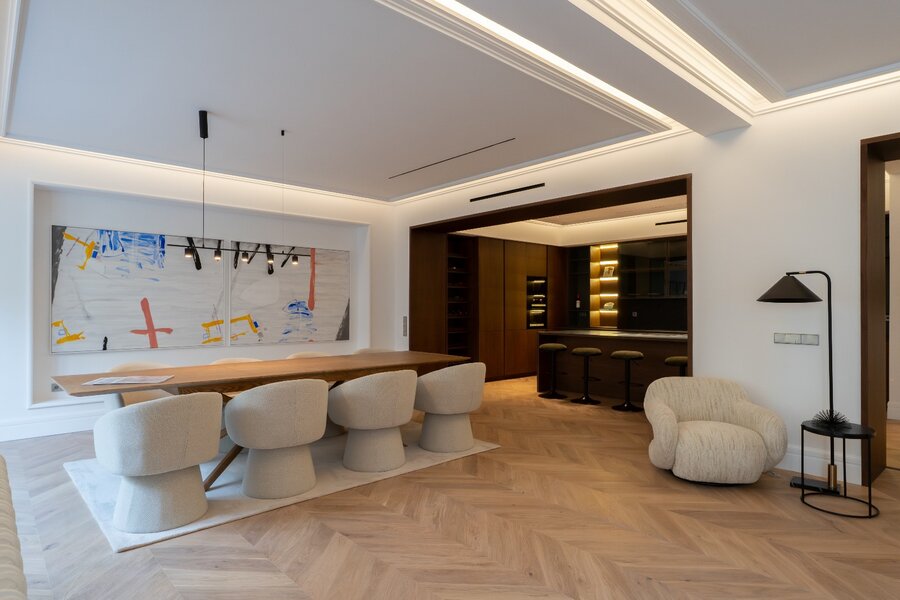 This residence is situated in the prestigious Castellana neighborhood, one of the most exclusive and sought-after areas of Madrid. Renowned for its elegant historic buildings, embassies, and headquarters of important companies, this area is home to several diplomatic missions, including those of the United States and Italy.