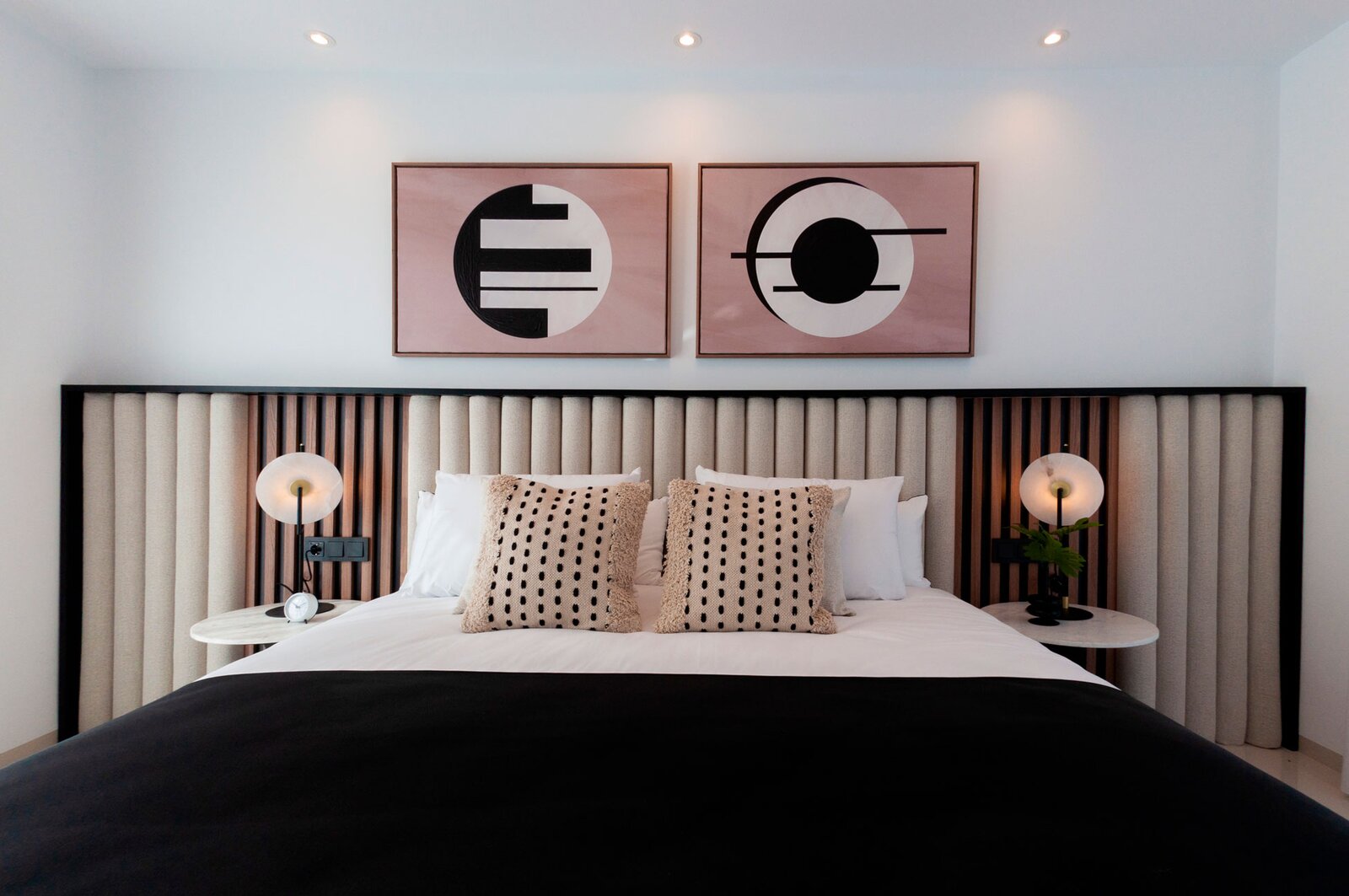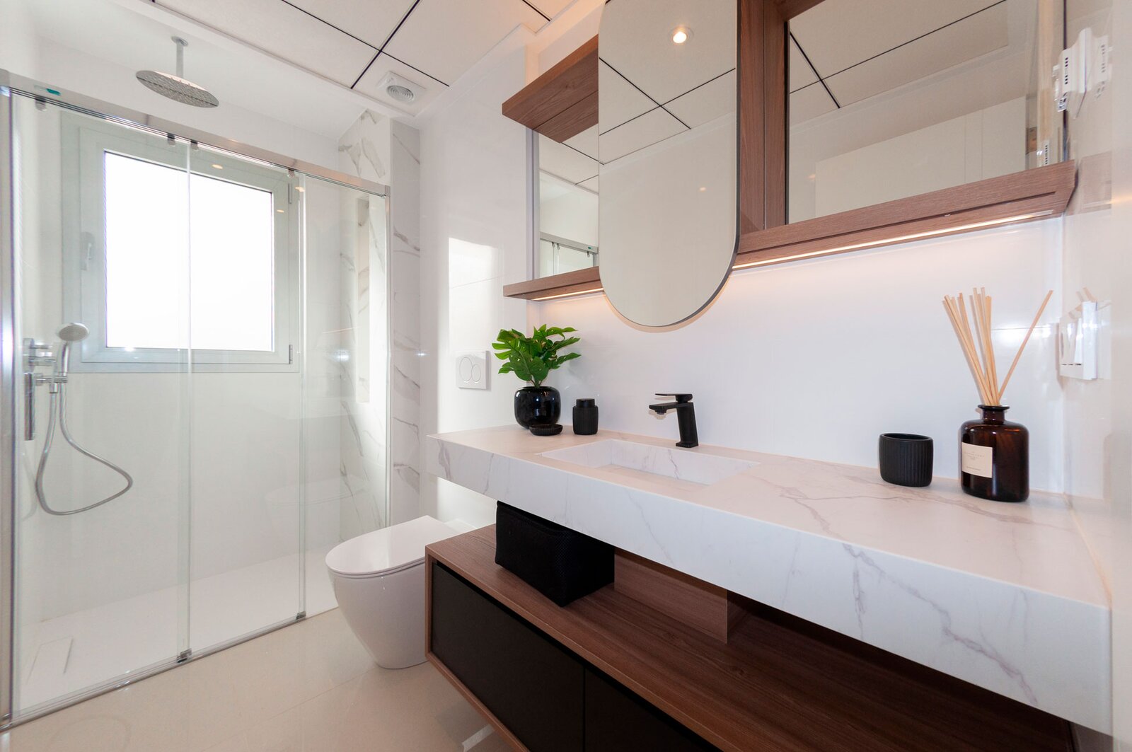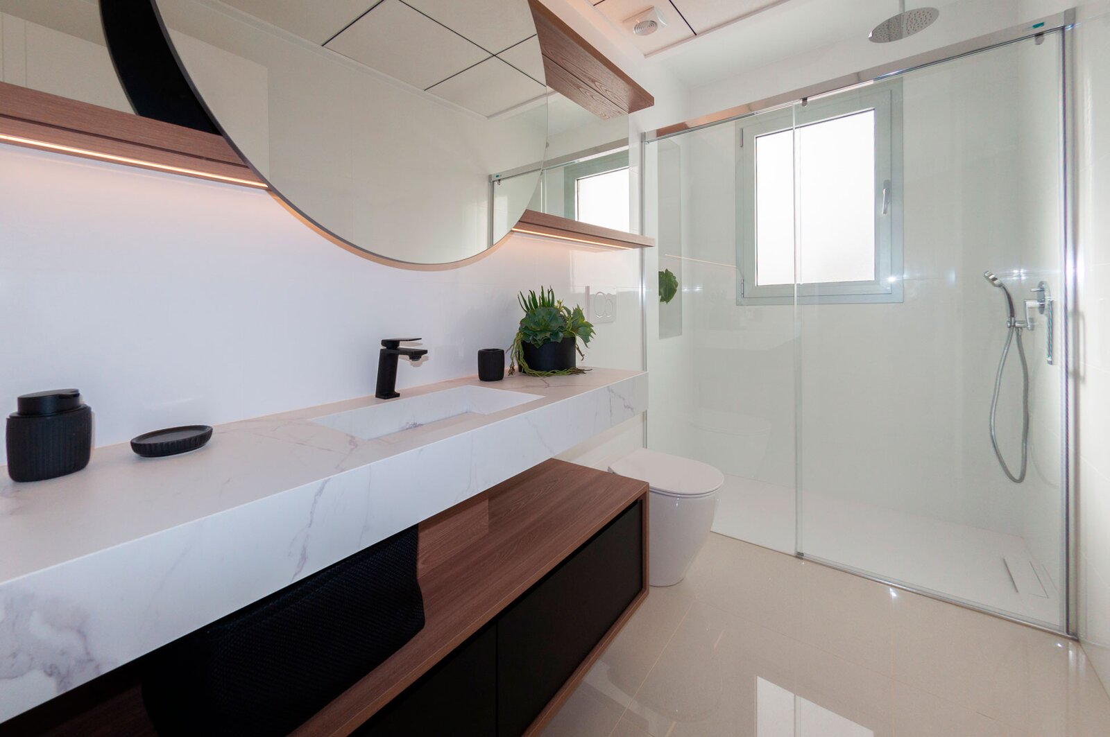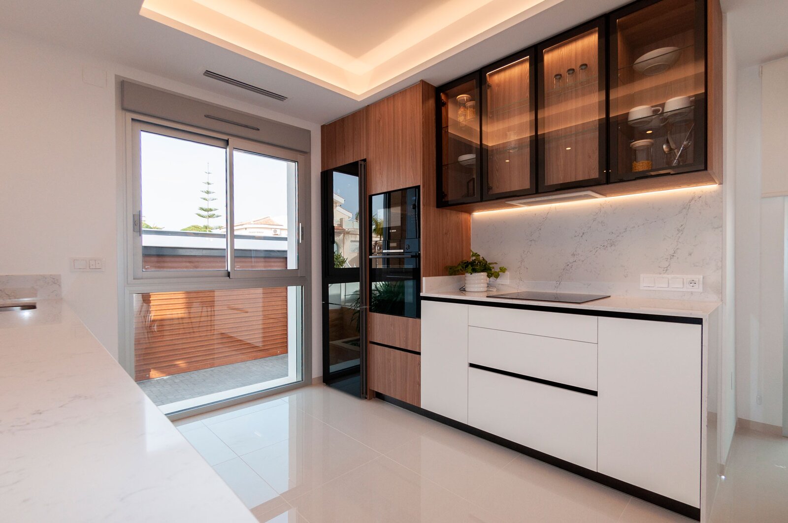 The property has a mix of contemporary and Mediterranean architectural styles, so white color and wood material predominate. The property consists of a 425 m2 plot with a 147 m2 terraces surface and 38 m2 solarium.