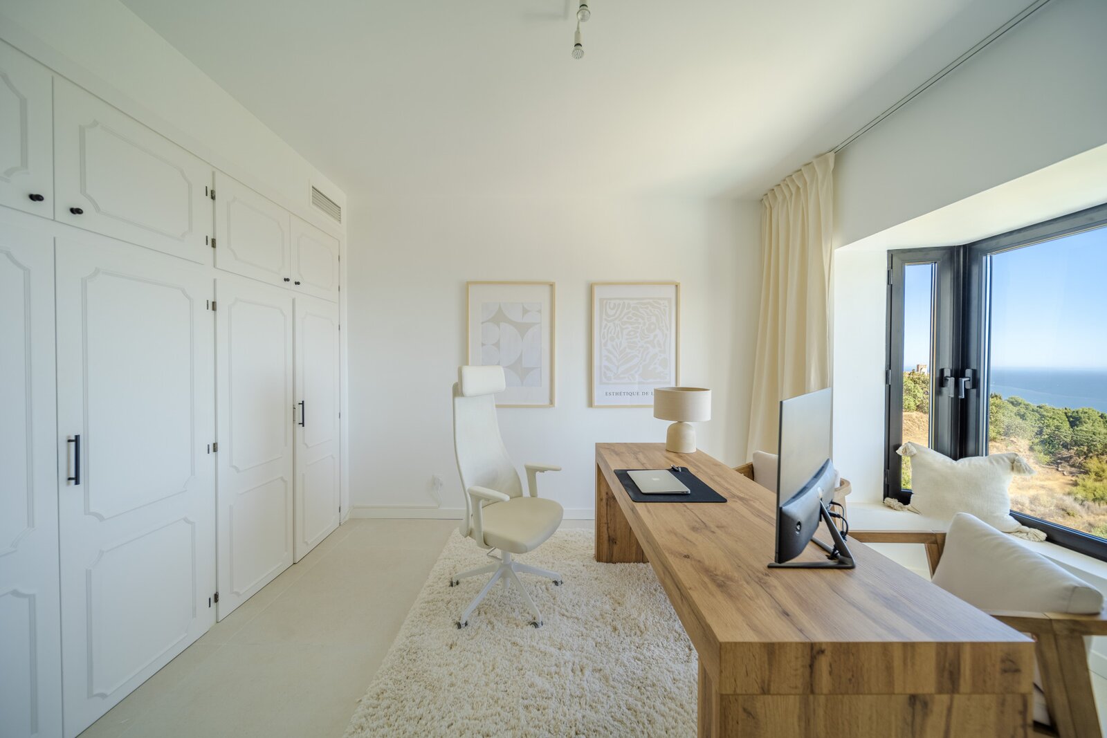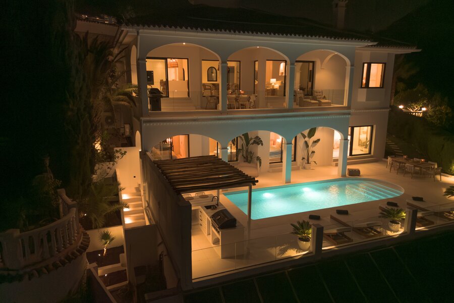 The exterior of the villa envelops you in an atmosphere of serenity. Its cosy and elegant architecture spread over two floors, stands out against the greenery and blue skies of the Costa del Sol. The crown jewel of the exterior is undoubtedly its heated pool, inviting you to enjoy a swim any time of the year. Relaxed living is embodied in its outdoor area, where a kitchen equipped with a barbecue awaits those unforgettable moments with family or friends, whether in the heart of summer or during winter afternoons. The villa is located in a quiet residential area on a cul-de-sac, ensuring maximum peace away from the hustle and bustle of traffic.