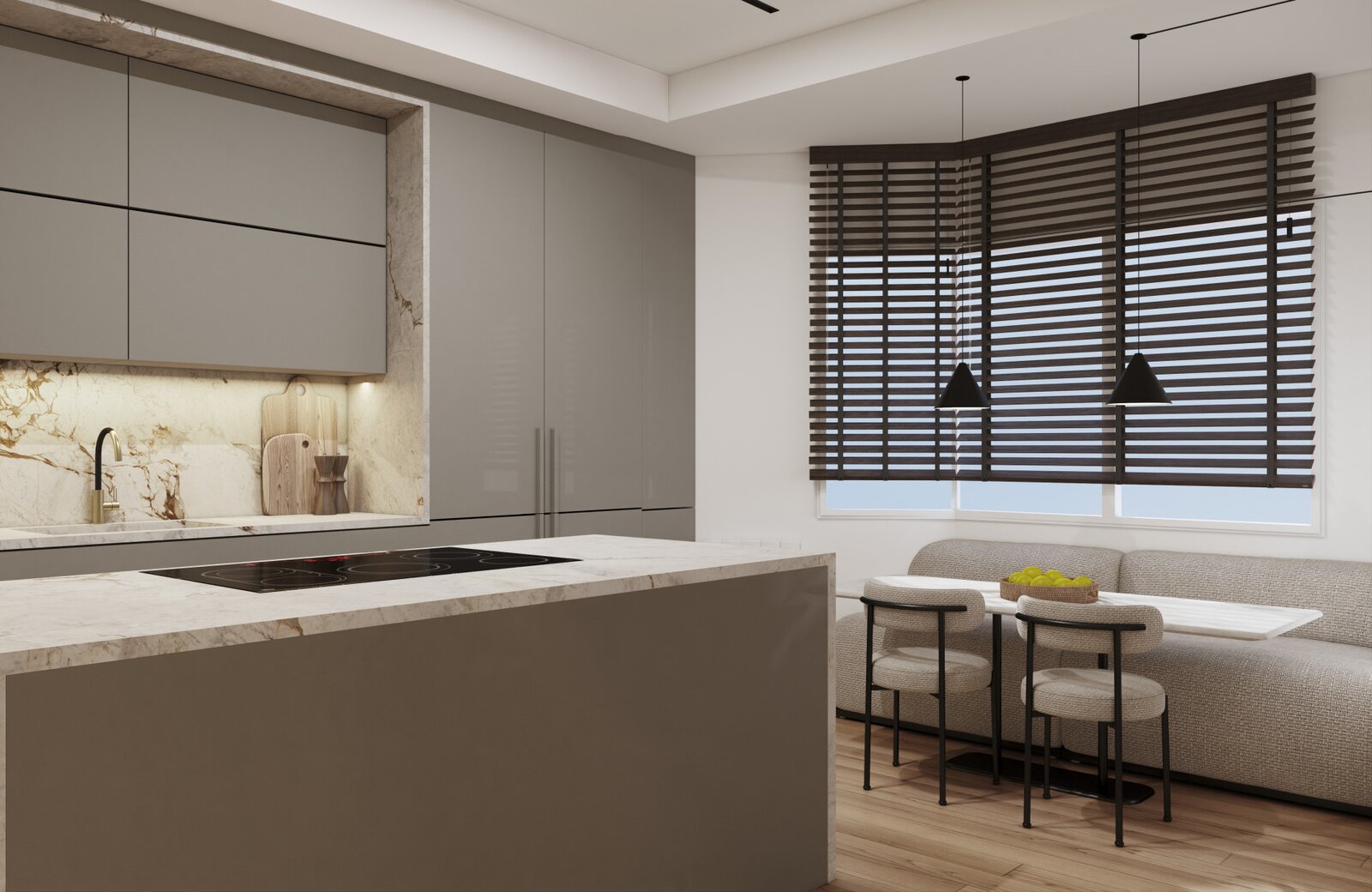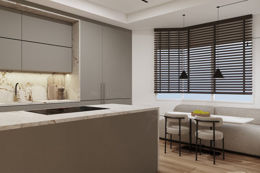 Upon entering, you are welcomed by a bright and expansive living-dining area, thoughtfully designed to create multiple environments, perfect for both relaxation and entertaining guests. From this space, you can access an elongated terrace that extends the living area outdoors, providing an ideal setting for enjoying the fresh air. The kitchen, fully equipped with top-of-the-line appliances, is seamlessly integrated into the design and is complemented by a nearby guest toilet for added convenience.