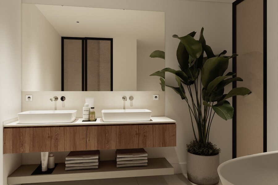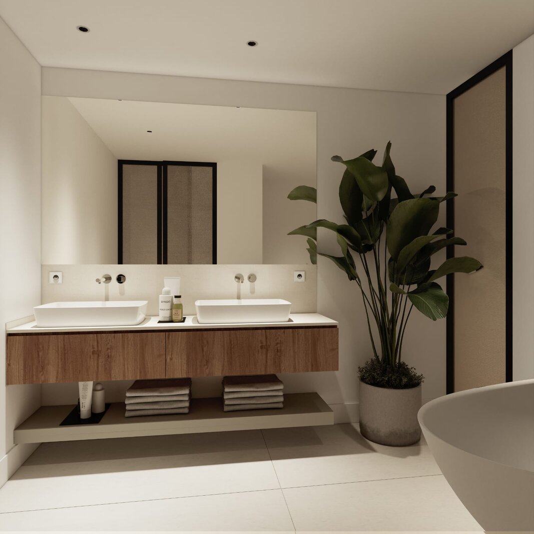 The private quarters consist of three en-suite bedrooms, each with its own private bathroom, ensuring both comfort and privacy. Additionally, there is a service bedroom with its own bathroom and an adjacent laundry area, providing practical solutions for everyday living.