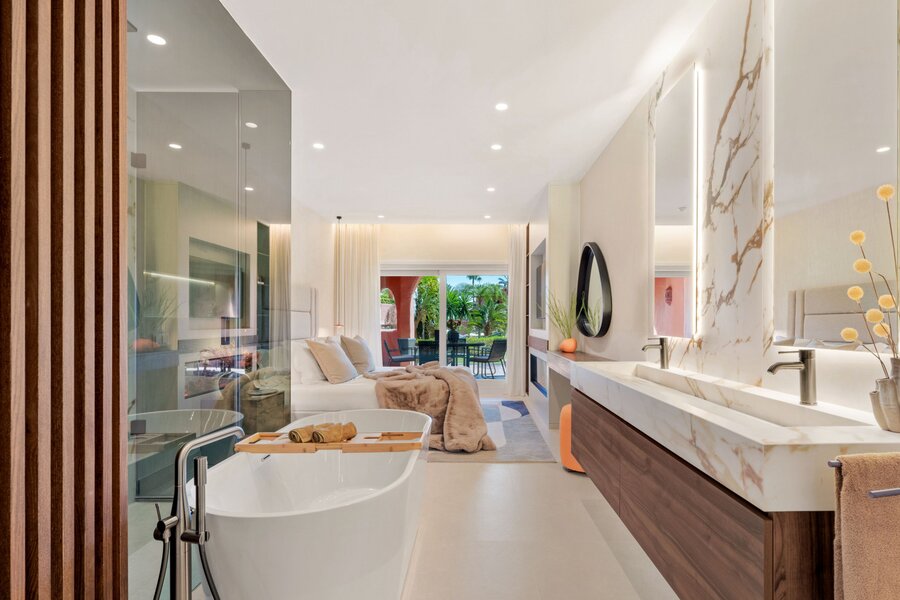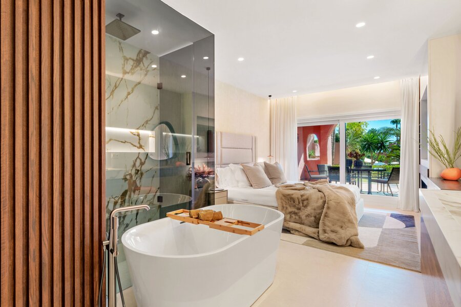 Extraordinary apartment in Torre Bermeja, completely refurbished in 2023 to the highest market standards. It is located in the exclusive area of the New Golden Mile in Estepona. Its ground floor location offers enchanting views over the lush gardens and is a front-line beach. The property boasts a spacious and luxurious open plan living space.