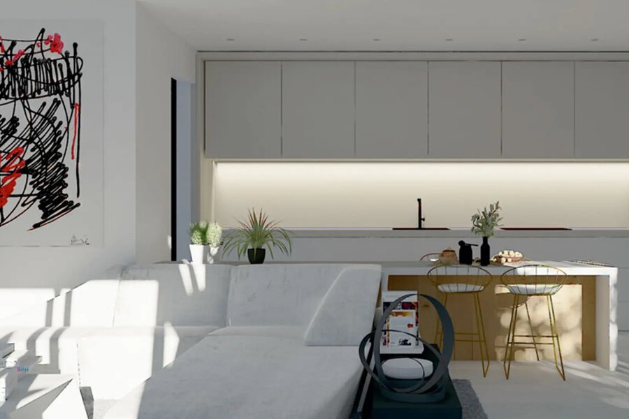 The apartments are characterized by abundant natural light, thanks to the large terrace that surrounds the apartment, creating a warm and welcoming atmosphere. The interior design highlights a spacious open-plan living and dining area. A home automation system for electric blinds, among other features, aerothermal heating, and excellent quality materials make the apartment a home of true luxury and comfort.