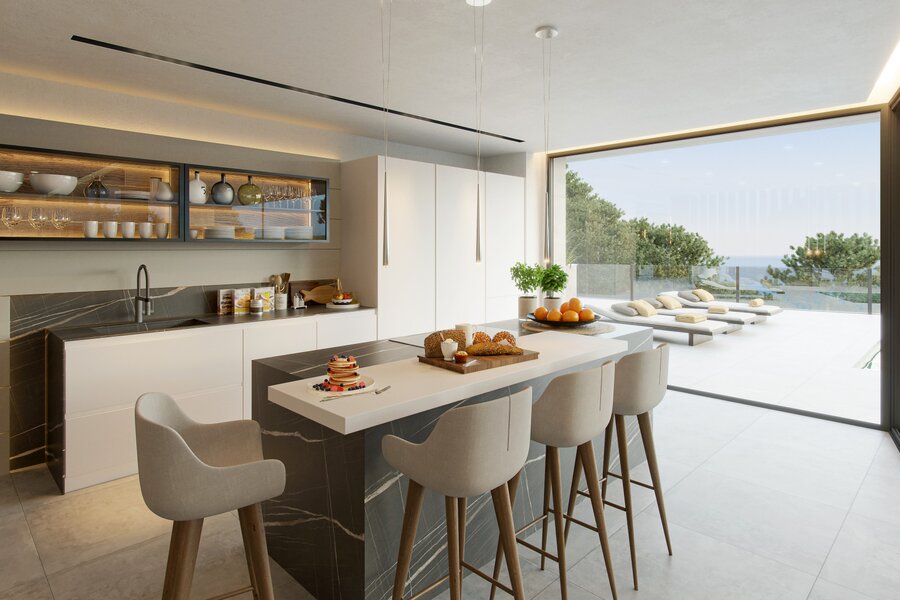 This exclusive contemporary villa features a modern, customizable kitchen, with large windows that flood the elegant living areas with natural light. The basement houses a multipurpose room, a garage for three cars, a wine cellar, and storage rooms. On the main floor, a spacious living-kitchen area, covered terraces, a solarium, and a pool create the perfect space for relaxation.