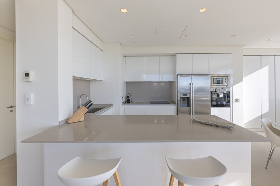 The interior of this residence blends contemporary elegance with absolute functionality. The spacious living-dining area, featuring a comfortable sofa, opens up to a fully equipped open-concept kitchen with high-end appliances and a breakfast bar ideal for socializing. This space is designed for comfort and connection in a warm, welcoming atmosphere.
