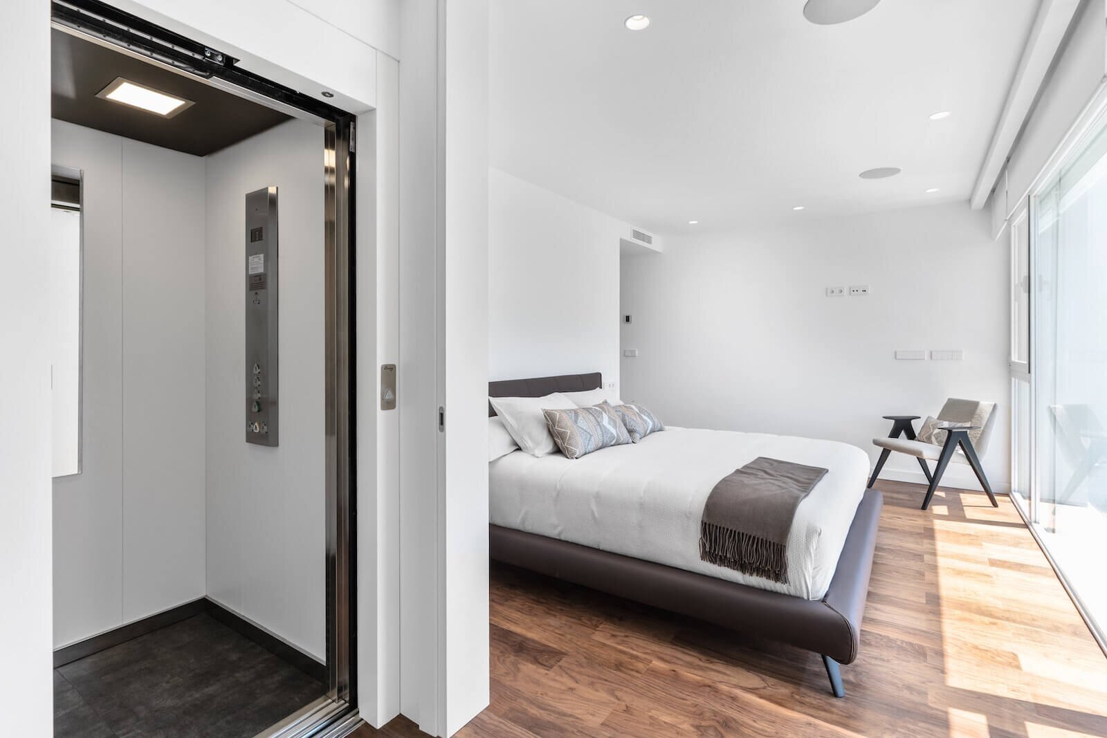 The property is distributed over several levels, connected by a private lift. The main floor features open and light-filled living spaces, including a lounge, dining area and a fully equipped kitchen with high-quality SIEMENS appliances, a wine cabinet and a wine fridge.