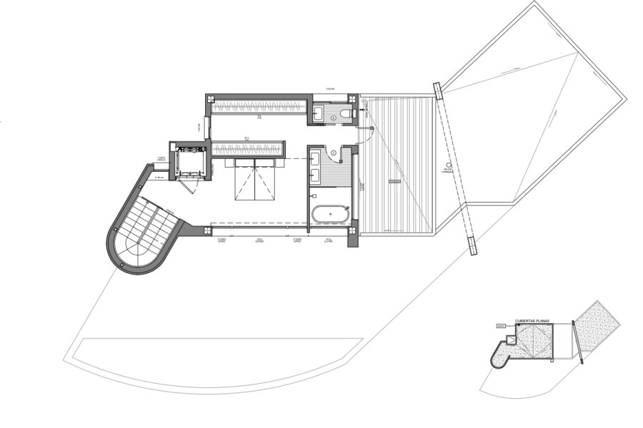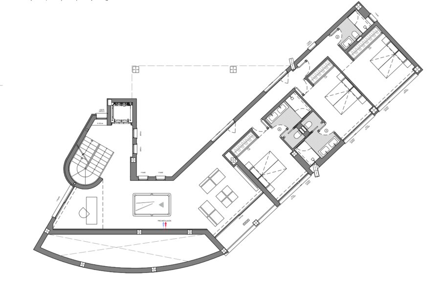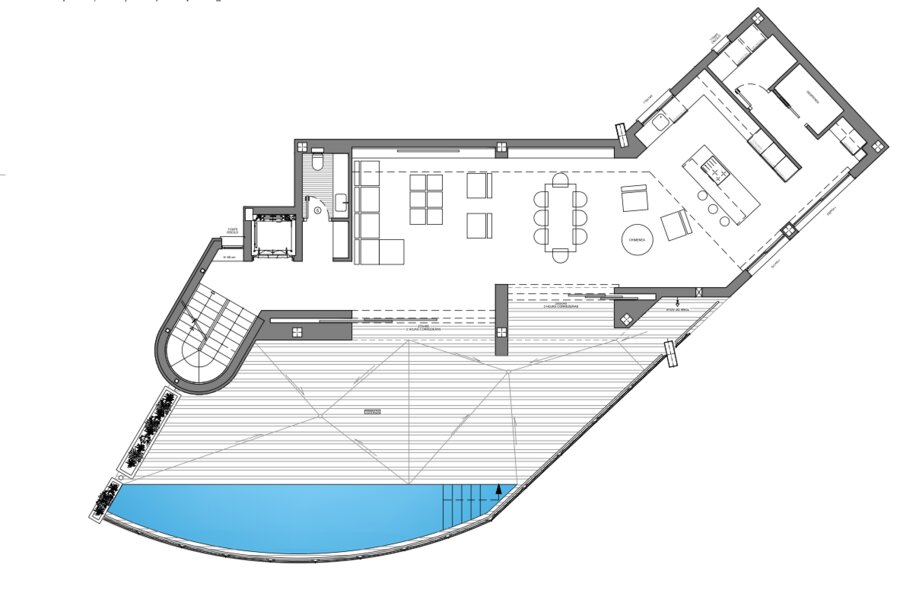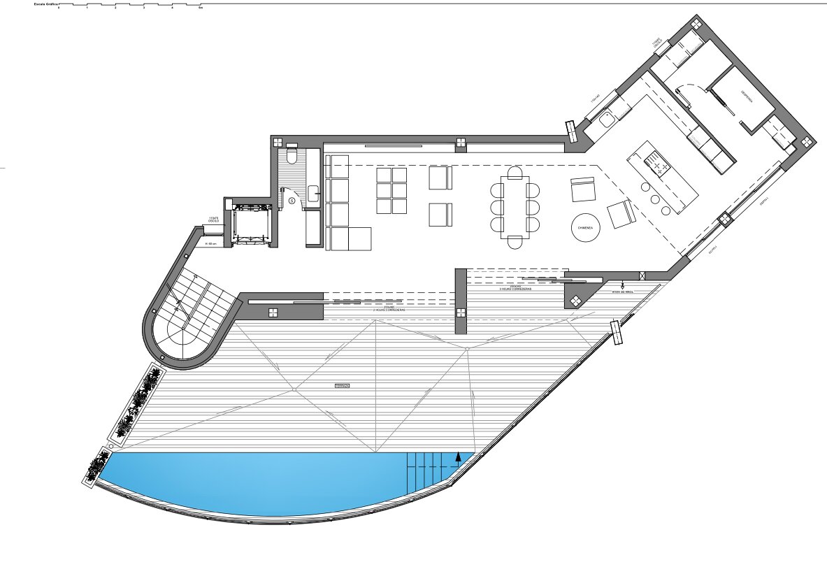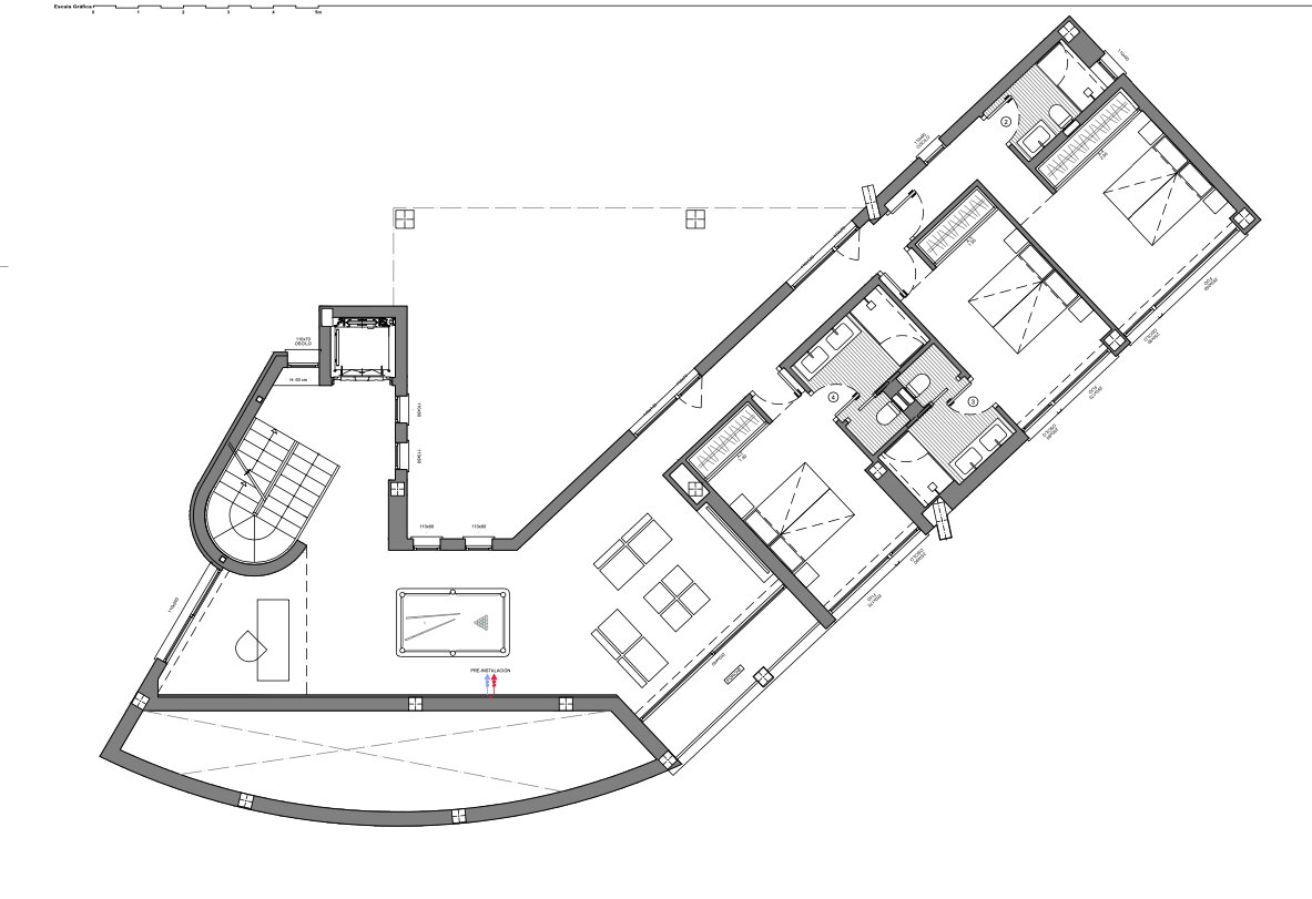 The lower level comprises four spacious bedrooms, a relaxation area with television and billiards, a separate office and storage areas. The master suite occupies the entire top floor and offers a generous bedroom, dressing room, bathroom with bathtub and a private terrace with sea views.