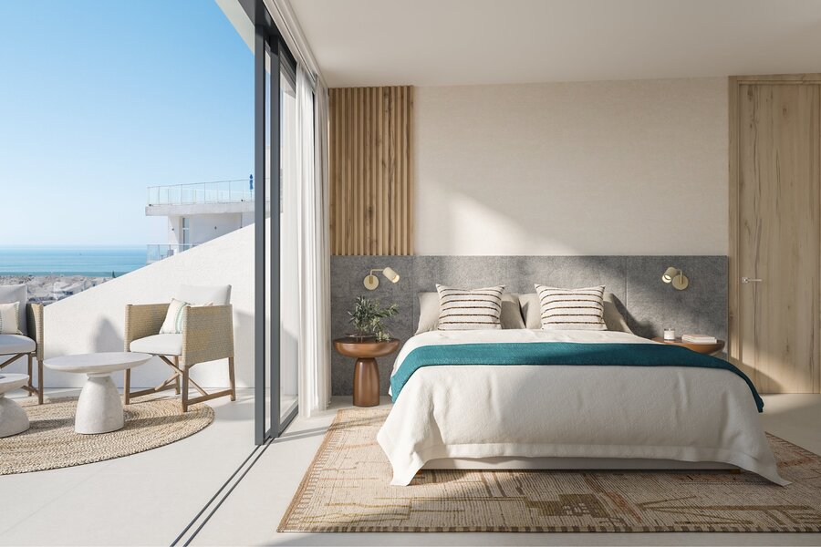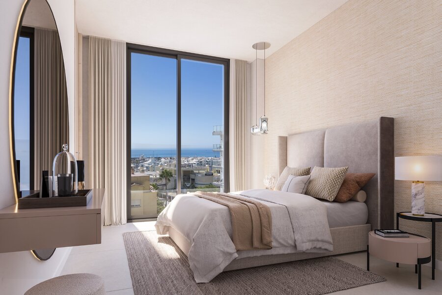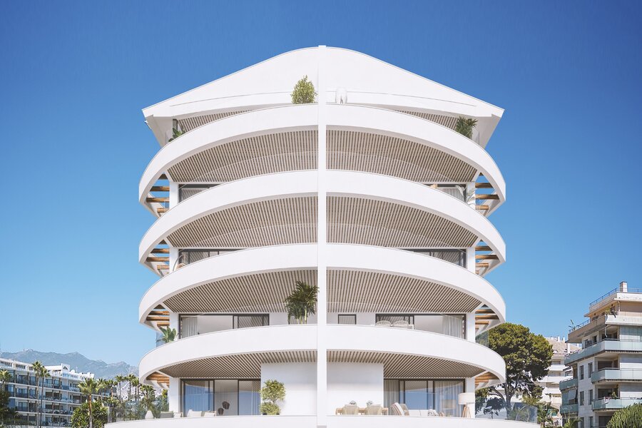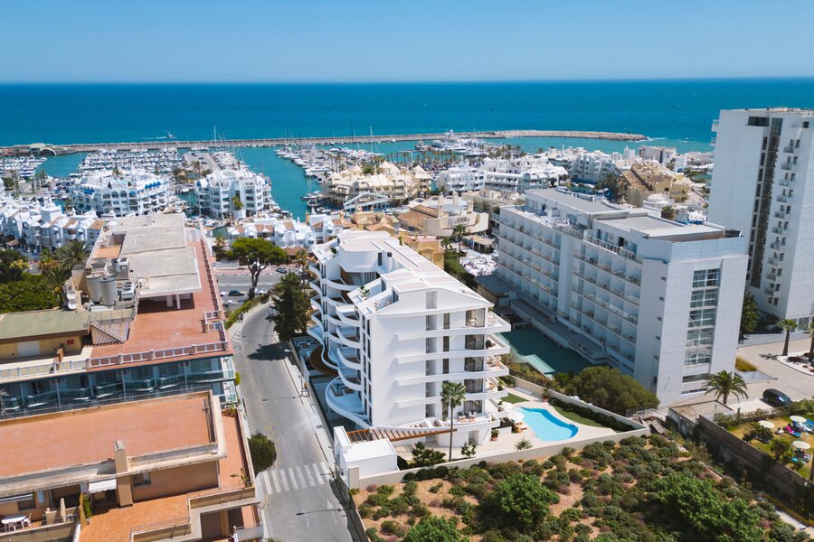 Modern design building in the shape of a boat close to Puerto Marina. It also stands out for its excellent qualities, an enclosed area with a swimming pool and chill-out zone, ideal for relaxing and enjoying the climate of the Costa del Sol. In addition, the properties are built according to the most demanding parameters of the CTE for optimum energy efficiency and to maximise energy savings.
