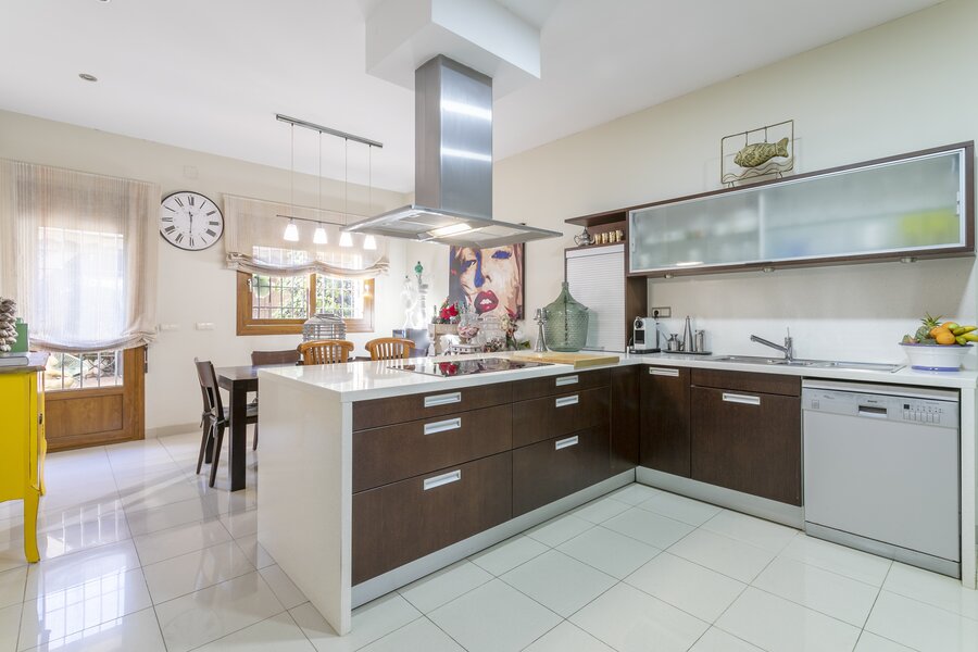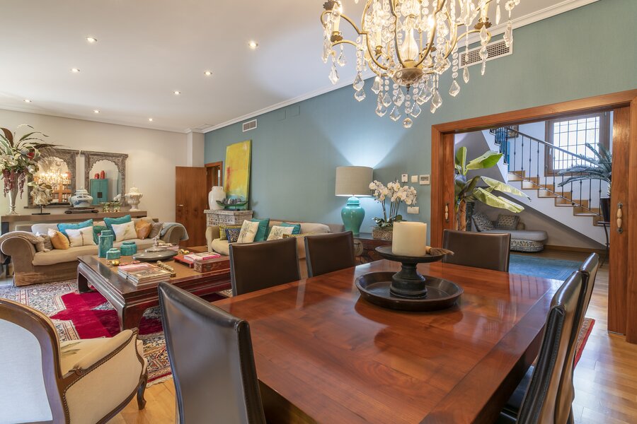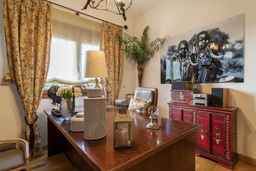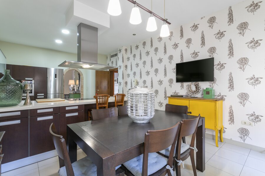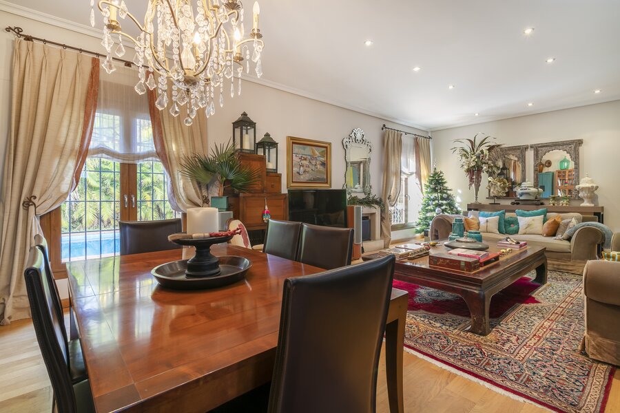 La maison, d’une superficie de 400 m², comprend deux niveaux. Le rez-de-chaussée avec un salon-salle à manger spacieux et élégant, une cuisine moderne avec accès à la piscine, un bureau et une salle de bains complète.