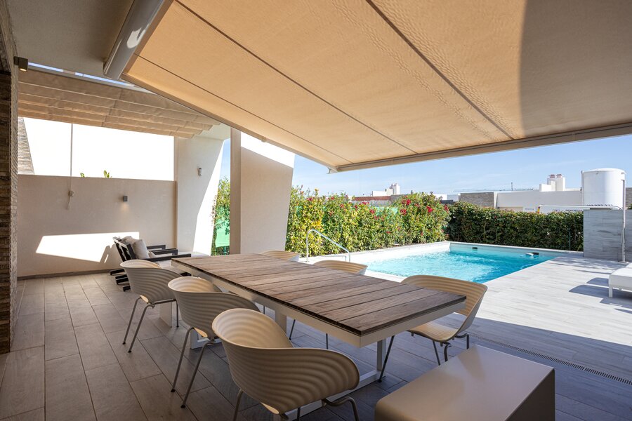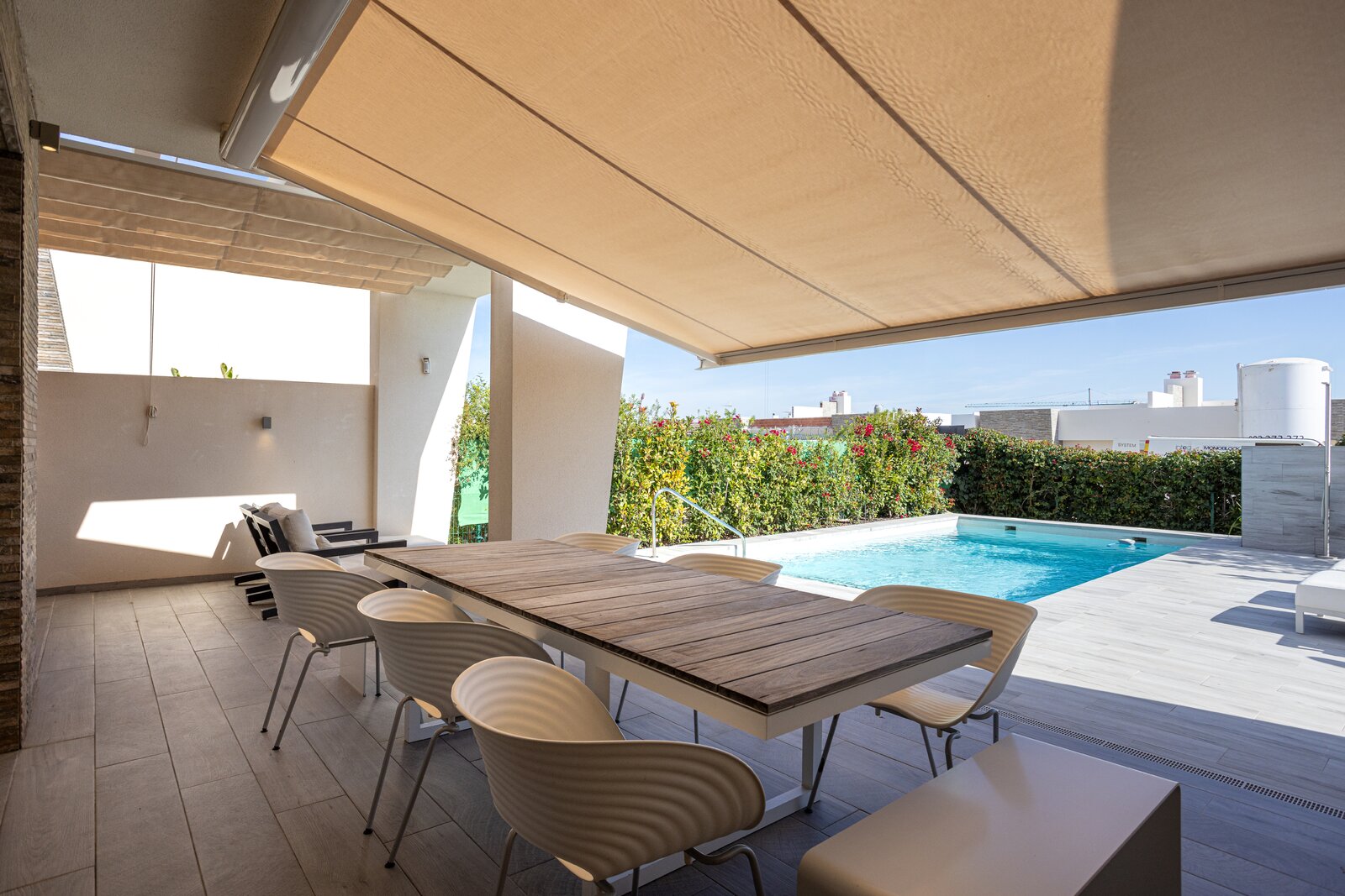 Het privézwembad (7 m x 4 m) is stijlvol afgewerkt en voorzien van een buitendouche. Daarnaast is er een gemeenschappelijk zwembad van 78 m² gelegen in een bijzonder mooie gedeelde tuin van 417 m² — ideaal voor sportieve zwemmers.
