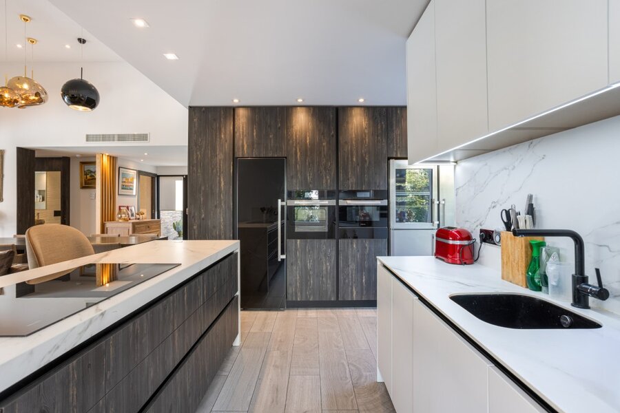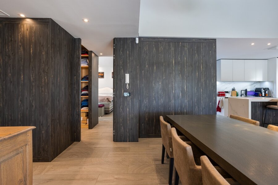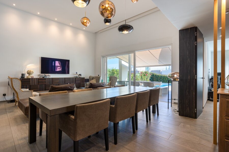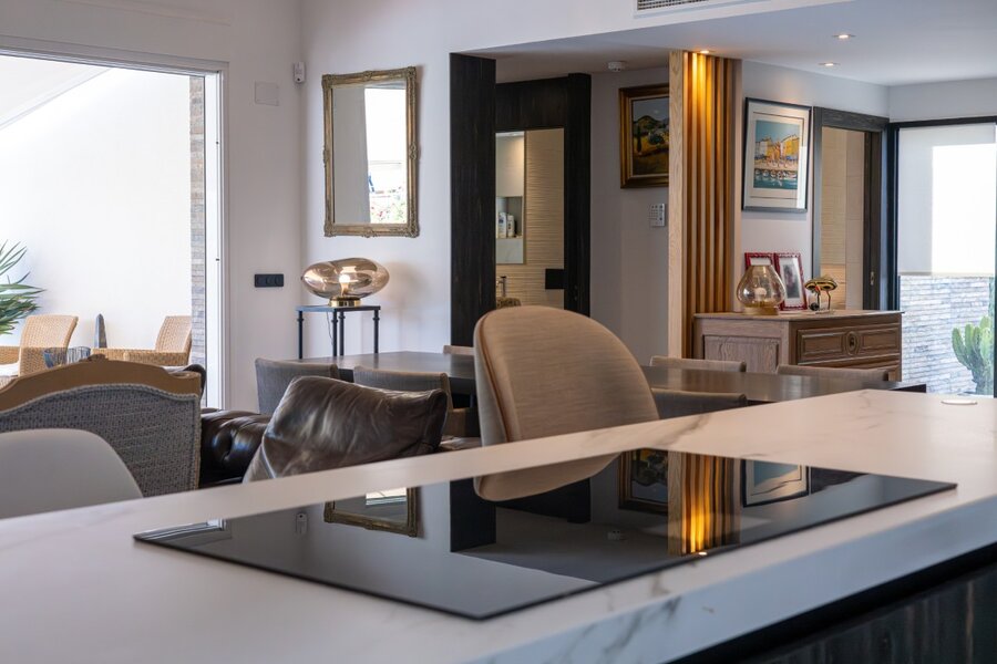 De lichte en royale leefruimte is ingericht met een stijlvolle designluster en een professioneel uitgeruste open keuken. De eigenaar, een internationale ondernemer in de hotelwereld, heeft meer dan € 200.000 aan hoogwaardige upgrades laten uitvoeren bovenop de standaardbouwwaarde.