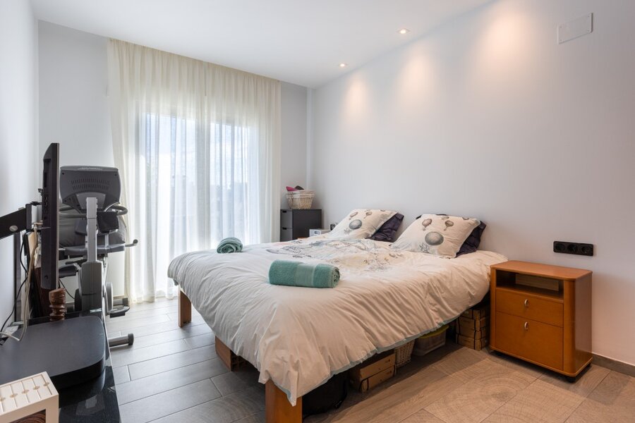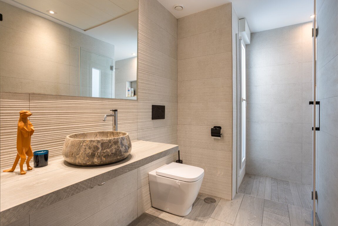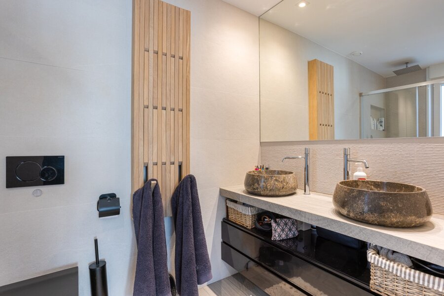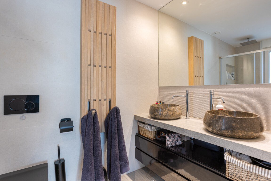 De woning telde oorspronkelijk 3 slaapkamers, waarvan één slaapkamer nu luxueus is omgevormd tot volwaardige dressing. De overige twee slaapkamers beschikken elk over een en-suite badkamer, en er is een afzonderlijk gastentoilet.