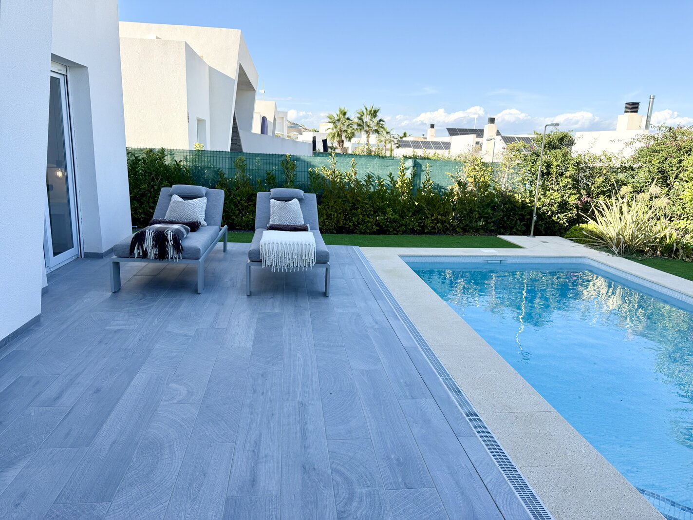 De villa beschikt over 3 slaapkamers en 2 badkamers, en een ruime woonkamer die uitgeeft op de tuin met zicht op het zwembad.