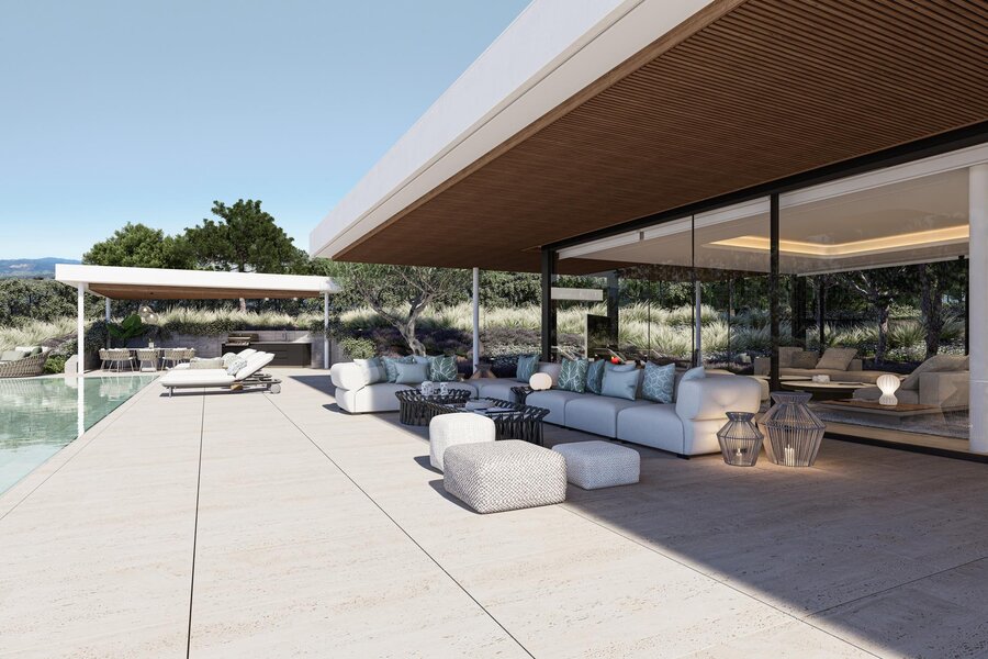 De interieurs en exterieurs vloeien natuurlijk in elkaar over, dankzij de grote ramen die het licht in elke hoek laten doordringen. De buitenruimtes bieden de perfecte setting om de sereniteit van het omringende landschap, inclusief de golfbaan, volledig te ervaren.