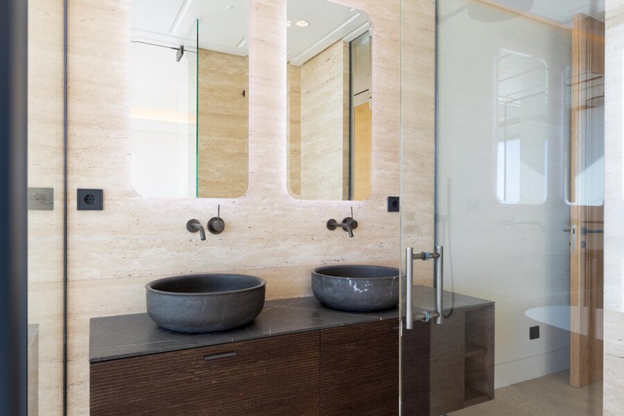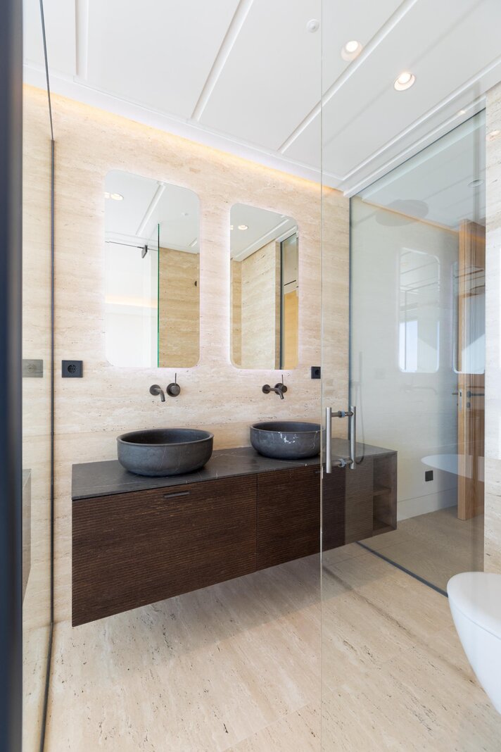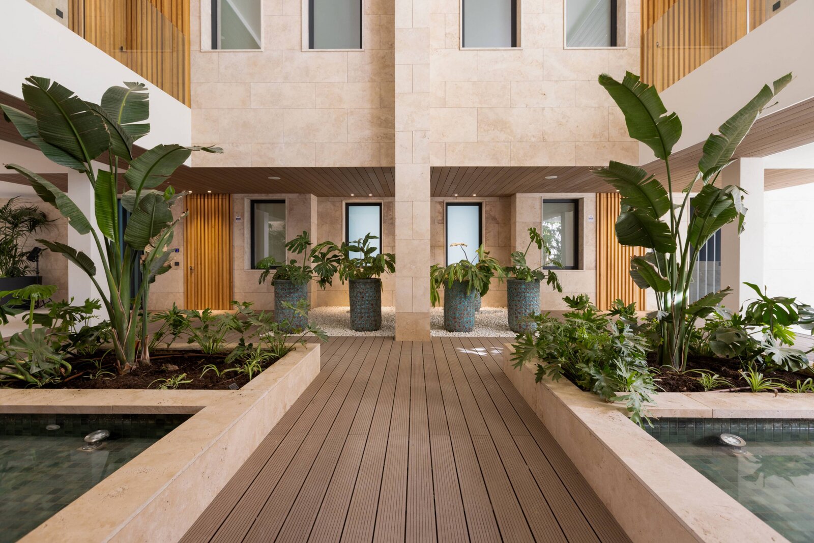 Omdat het aan de oevers van de Middellandse Zee ligt, zijn de uitzichten spectaculair en de omgeving uniek. De bouwmaterialen zijn voornamelijk hout, marmer en glas van de hoogste kwaliteit. De drie elementen zijn gecombineerd met wijsheid en esthetische kennis. Ze komen vanuit de appartementen naar buiten en omsluiten de buitenkant van het gebouw volledig.