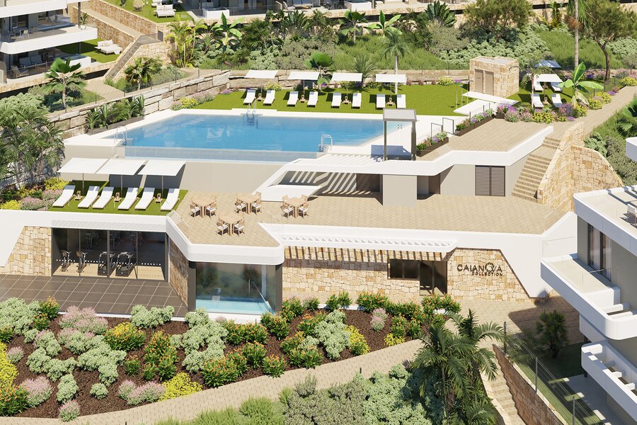 Dit prestigieuze complex bestaat uit laagbouwblokken met ruime twee- en driekamerappartementen, allemaal ontworpen met grote terrassen en open woonruimtes om optimaal te profiteren van natuurlijk licht en adembenemende vergezichten. De appartementen op de gelijkvloerse verdieping beschikken over een eigen jacuzzi en sommige zelfs over een privé tuin. De eerste- en tweede verdiepingen hebben royale terrassen met panoramisch uitzicht, terwijl de penthouses een dakterras en privé jacuzzi bieden.