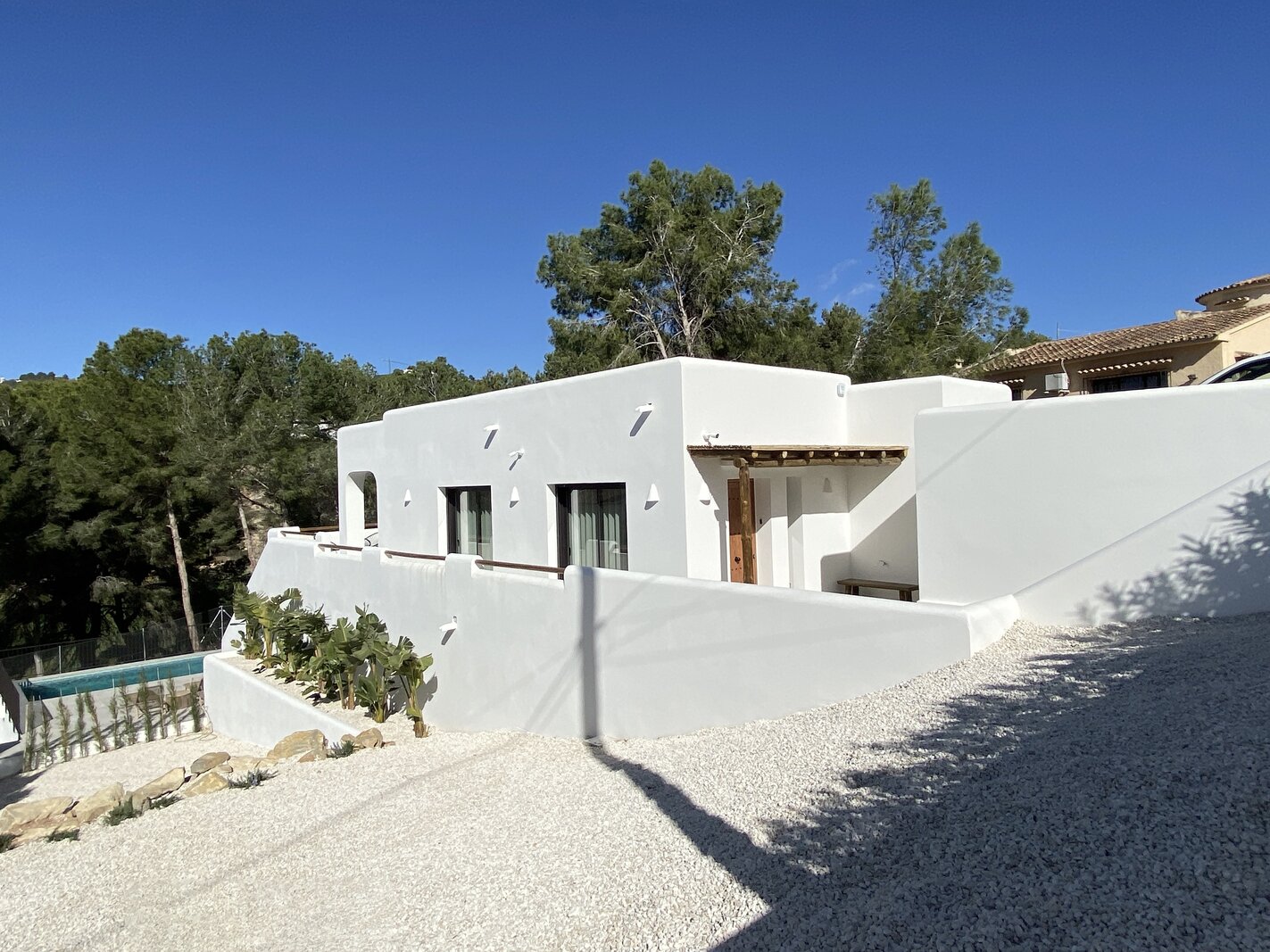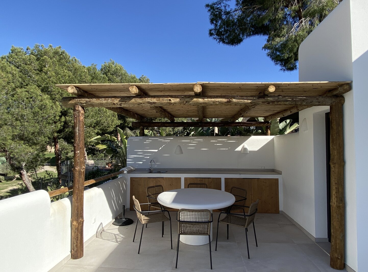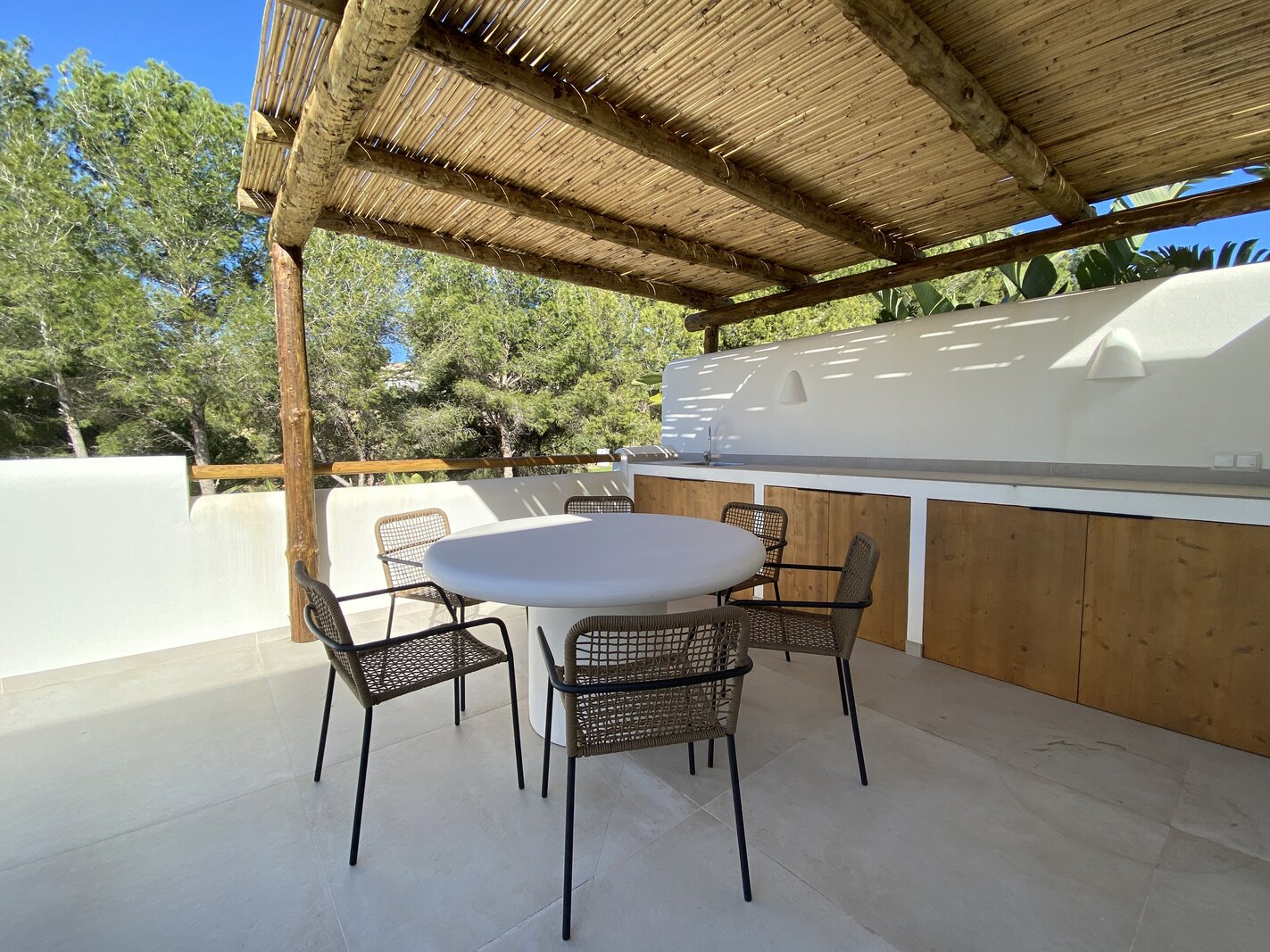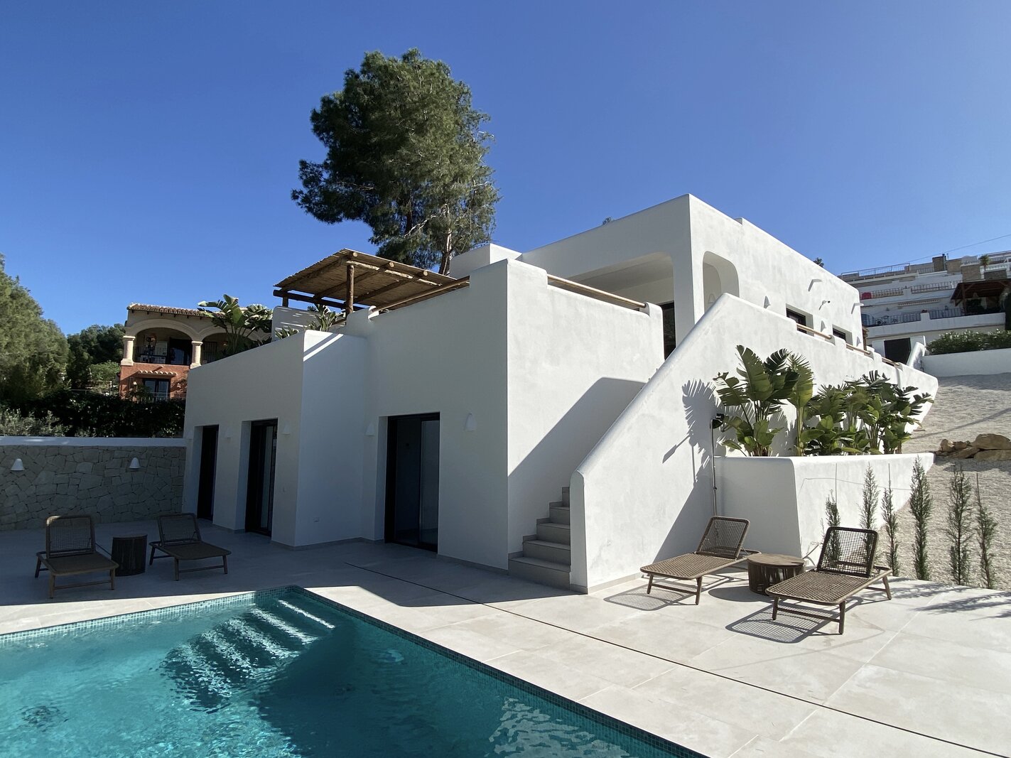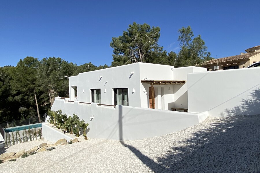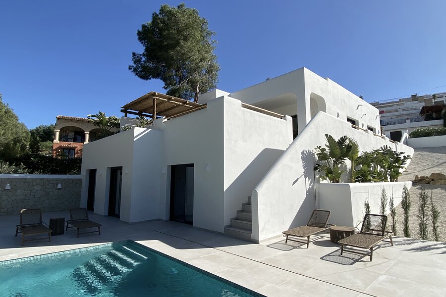 Dans le quartier très prisé de San Jaime (Benissa Costa), au calme et avec vue sur le Club de Golf Ifach, se trouve cette magnifique villa neuve en style Ibiza (2025). La maison a été achevée avec un souci du détail, où la pierre naturelle et les éléments en bois chaleureux créent une atmosphère méditerranéenne intemporelle. Une combinaison idéale de tranquillité, de confort et de proximité de toutes les commodités.