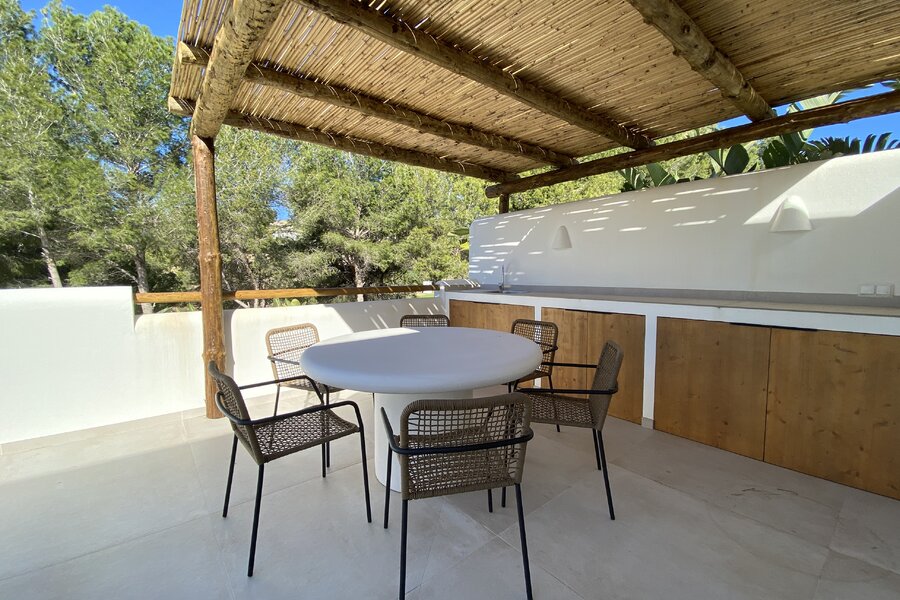 La vie extérieure est au cœur de cette villa. Depuis l'espace de vie, vous accédez à une grande terrasse, partiellement couverte, avec une cuisine d'été sous une belle pergola en bois, parfaite pour de longues soirées d'été. Depuis les chambres, vous avez un accès direct à la piscine (avec pré-installation pour le chauffage), entourée d'une vaste terrasse pour chaises longues et détente.