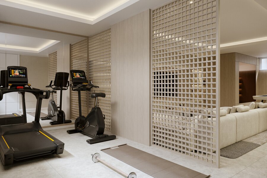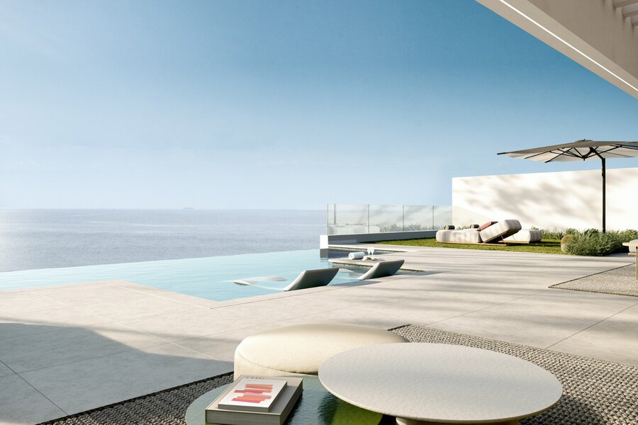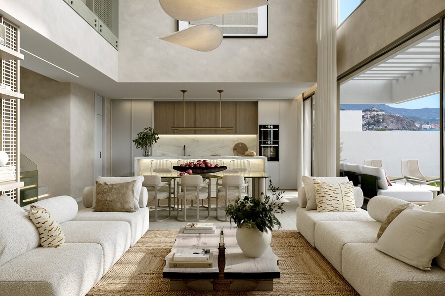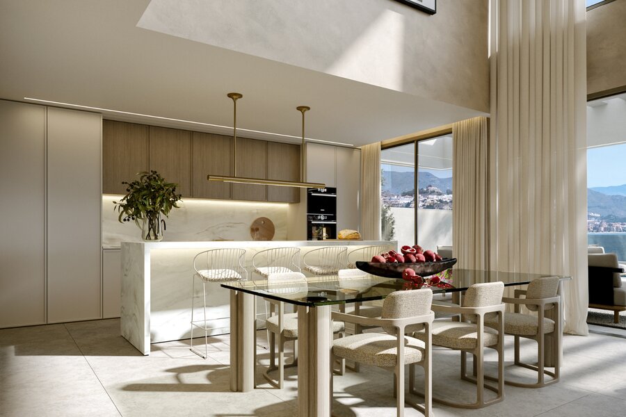 Elke villa biedt drie ruime en-suite slaapkamers, dubbele plafonds die de elegantie versterken en keukens uitgerust met de nieuwste generatie apparatuur. De interieurs onderscheiden zich door hun royale afmetingen en luxe afwerkingen. De woonkamer, met vloer-tot-plafond ramen, creëert een eindeloos gevoel van ruimte, terwijl de suites met privéterras en jacuzzi panoramisch uitzicht op zee bieden. De ruime terrassen en het onberispelijke ontwerp maken deze exclusieve ervaring compleet.