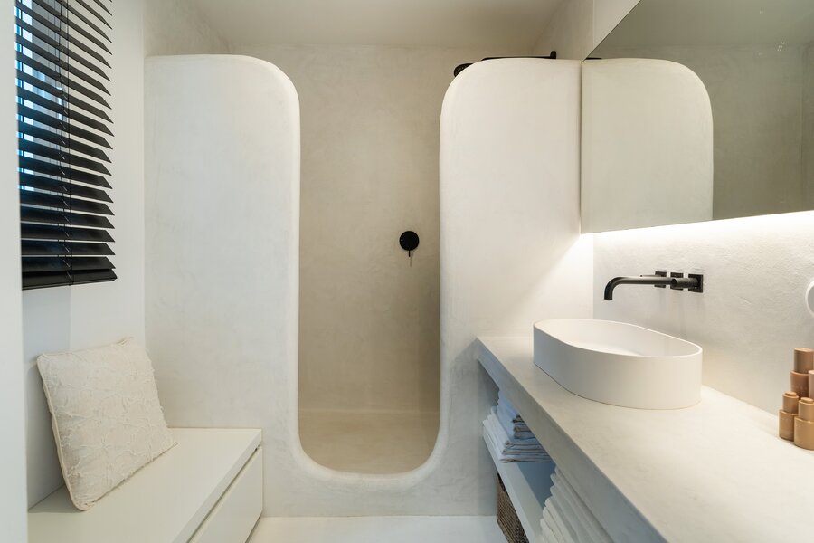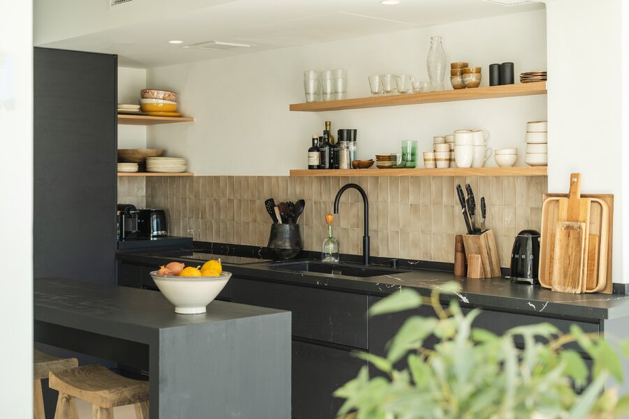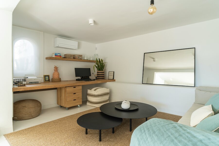 Op de onderste verdieping bevindt zich een ruime zithoek met een ingebouwde werkplek, een compacte keuken, een vijfde ruime badkamer en de technische ruimte. Schuifpuien leiden naar het grote verandagedeelte.