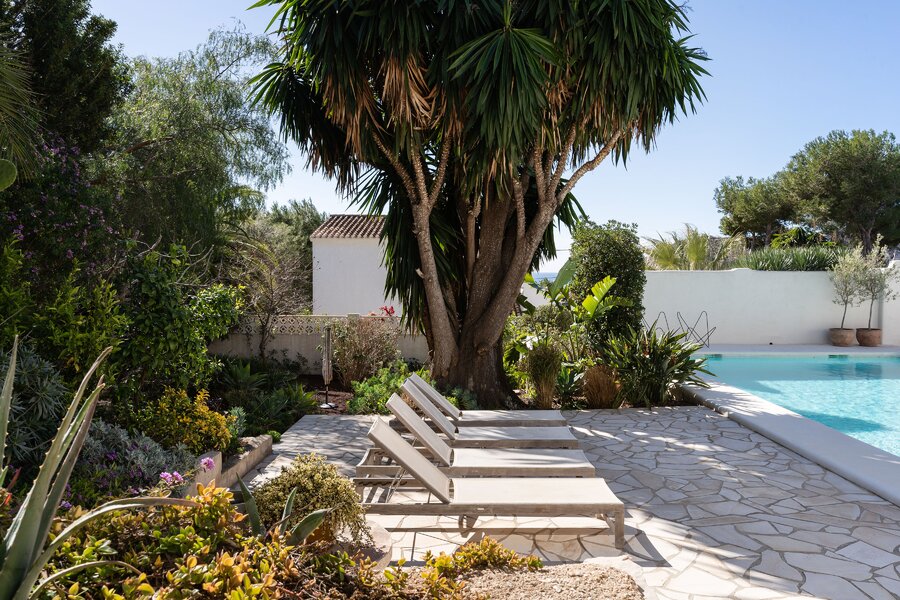 De onderhoudsarme tuin, voorzien van een beregeningssysteem, is onlangs verfraaid met nieuw groen tussen volgroeide bomen en struiken. In de tuin is er een vaste zithoek met openhaard en een beschutte buitenkeuken. Bij het ruime zwembad biedt een vaste ligbank een heerlijke plek om te zonnebaden. Achter een muur bevindt zich een groot overdekt terras voor verschillende recreatieve activiteiten.