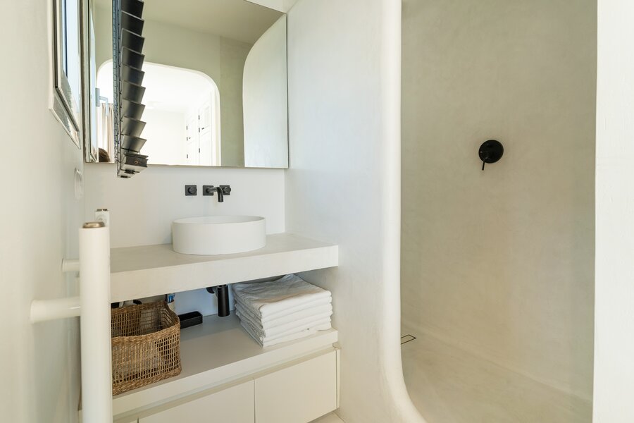 We beginnen bij de elektrisch bedienbare poort, die leidt naar een parkeerplaats voor twee auto's. Via een elegante buitentrap bereikt u de bovenste verdieping, die bestaat uit een zithoek, keuken, eethoek, twee slaapkamers met elk een eigen badkamer en ingebouwde kasten, een apart toilet en een ruim terras met een adembenemend uitzicht op zee. Een deur sluit de trap af, waardoor toegang mogelijk is tot de onderliggende verdieping. Deze bovenste verdieping kan feitelijk worden gebruikt als een volledig afzonderlijk appartement.