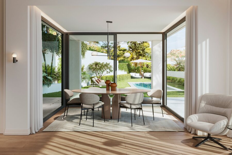 Het heeft een bebouwde oppervlakte van ongeveer 100 m2 en 75 m2 bruikbare ruimte. Op de begane grond vind je een spectaculaire ruimte waar de prachtige grote ramen het interieur en exterieur integreren en de woon-eetkamer vullen met licht. De keuken wordt verlicht door een binnenpatio en heeft toegang tot het terras, waar je een eetkamer buiten kunt installeren en kunt genieten van de rustruimtes en het prachtige uitzicht.