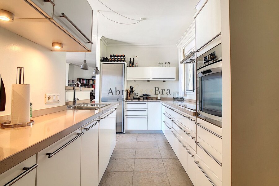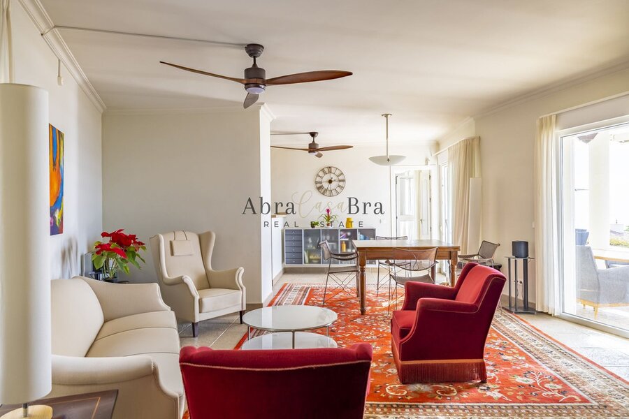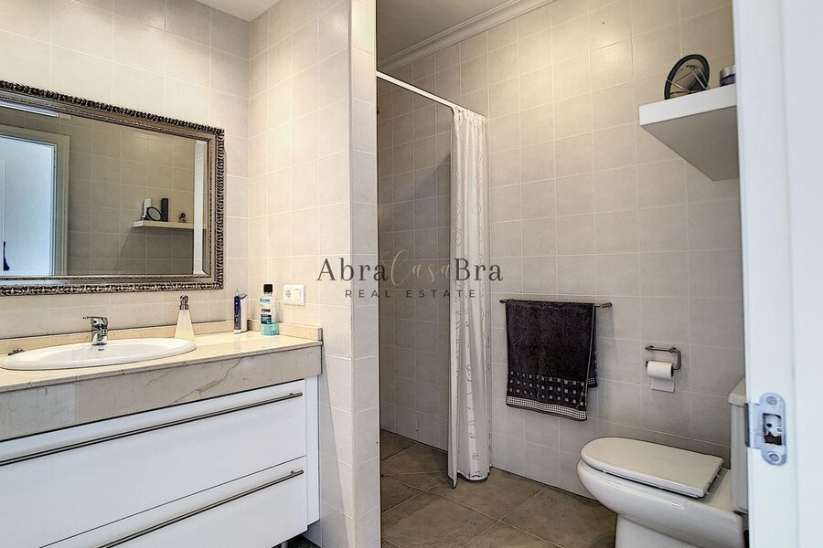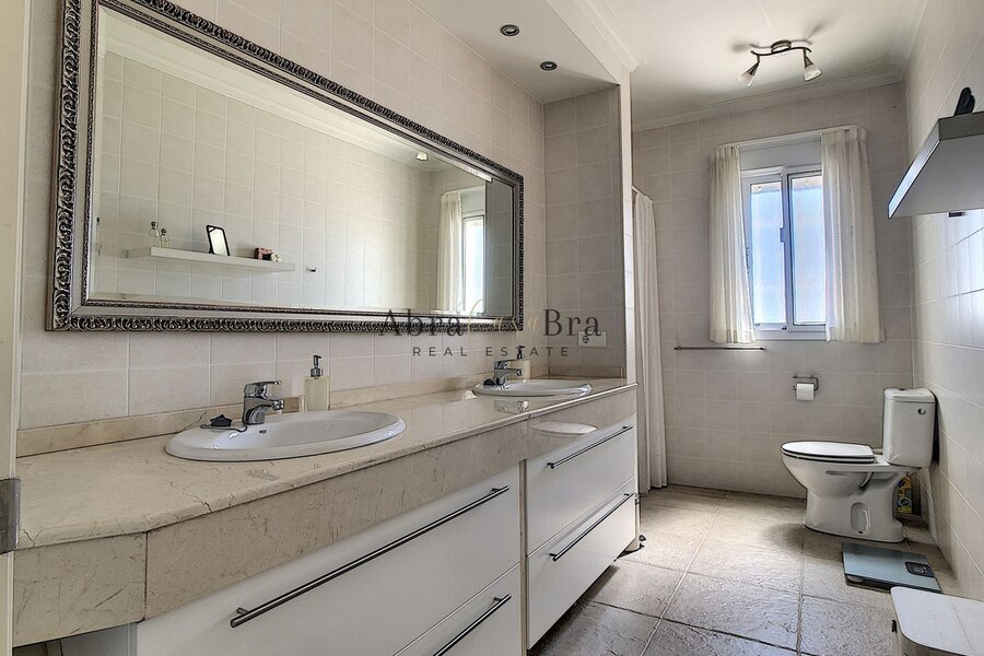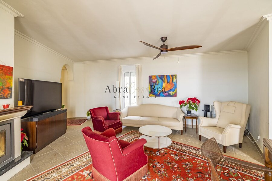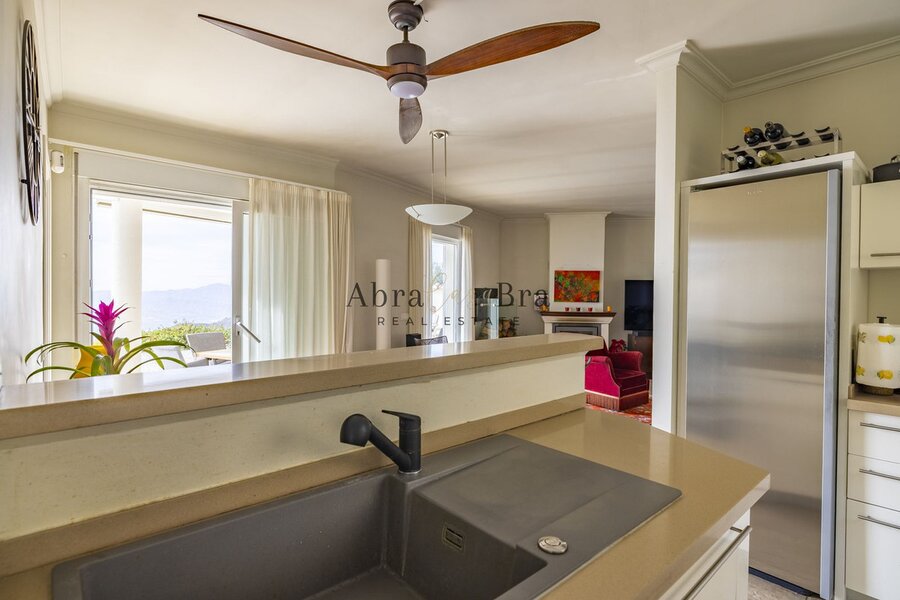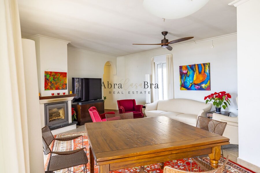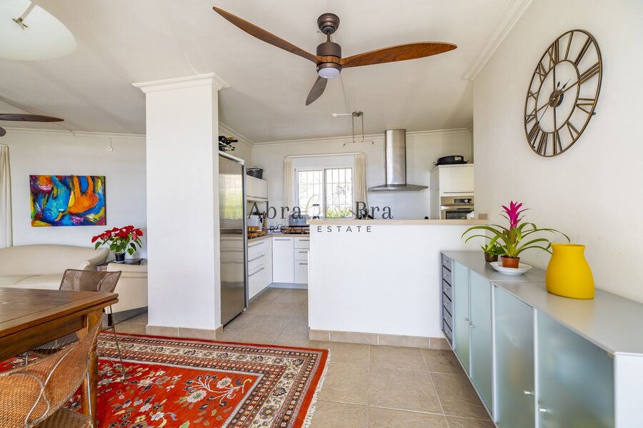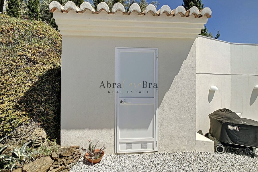 Het hoofdhuis is slim ingedeeld met een ruim woongedeelte, inclusief woonkamer en eetkamer, en een moderne open keuken uitgerust met hoogwaardige materialen en apparatuur zoals een voedselmolen in de gootsteen, inductiekookplaat, oven, vaatwasser, koelkast en vriezer. De leefruimte wordt verwarmd door een gezellige open haard en heeft airconditioning (warm/koud). De hoofdslaapkamer aan de rechterkant van de villa heeft inbouwkasten en een ensuite badkamer met inloopdouche, wastafel en toilet, verwarmd door vloerverwarming (elektrisch). Aan de linkerkant zijn twee slaapkamers met inbouwkasten en een familiebadkamer met inloopdouche, dubbele wastafel en toilet, ook verwarmd door vloerverwarming (elektrisch).