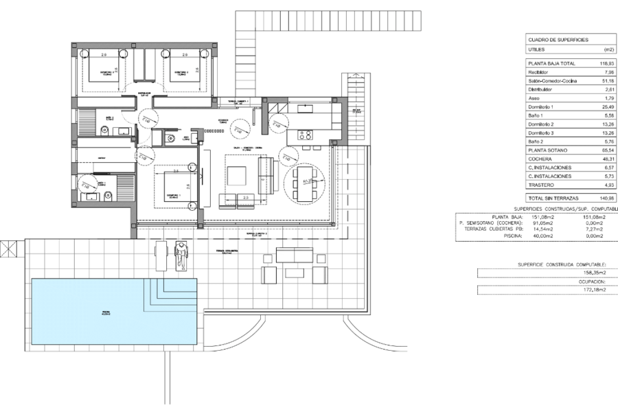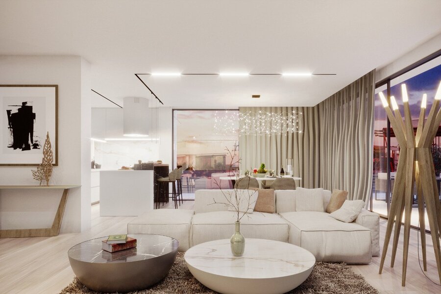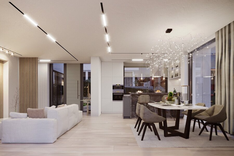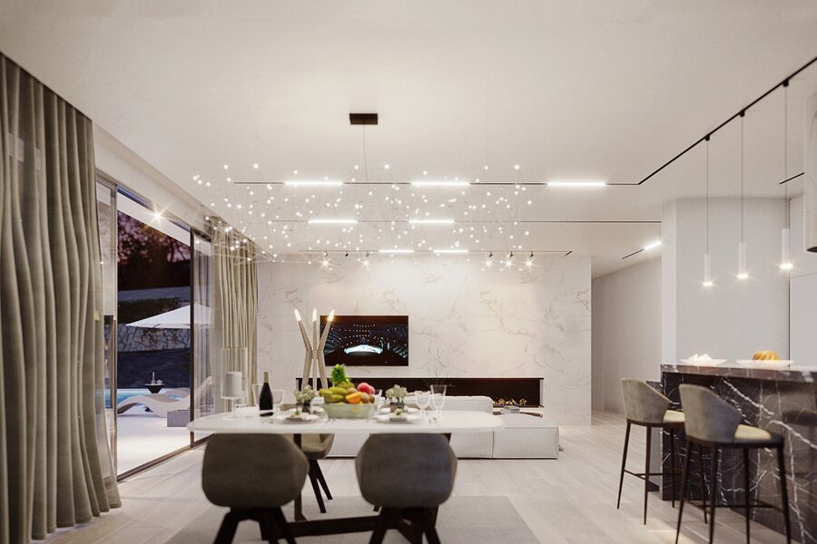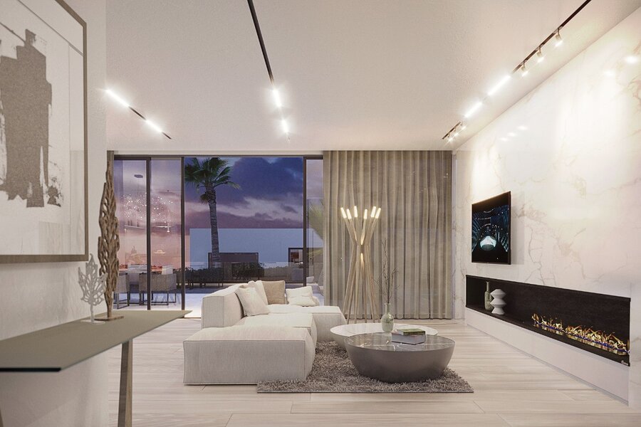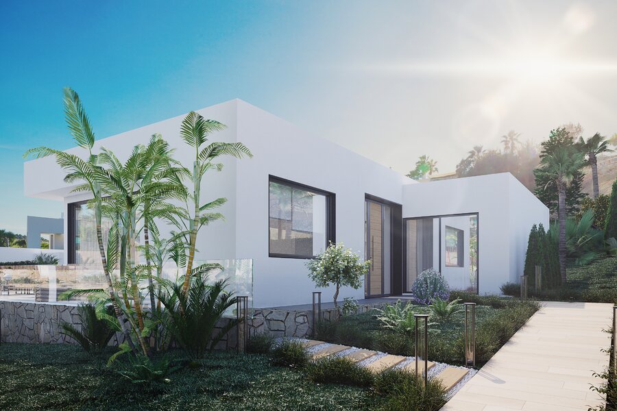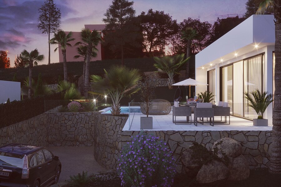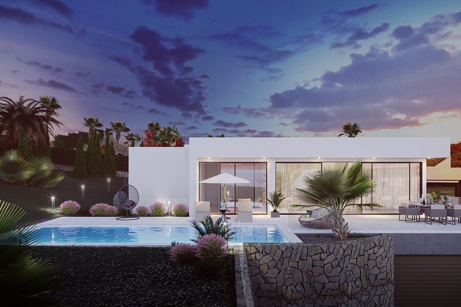 Nieuwbouw villa heeft 3 slaapkamers, 3 badkamers, open keuken met de zithoek, inbouwkasten, ruime terrassen, privé tuin met het zwembad en kelder met de garage.