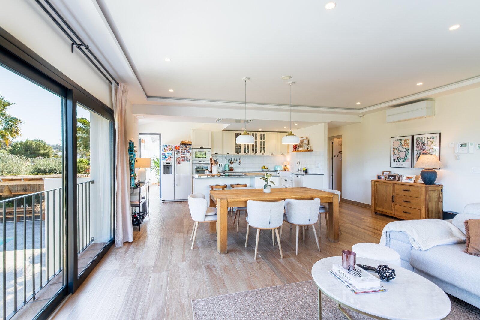 Op de hoofdverdieping (straatniveau) vindt u een lichtrijke leefruimte met een volledig uitgeruste open keuken. Verder zijn er drie slaapkamers, twee badkamers (waarvan één en-suite) en een ingeglaasde naya, ideaal om het hele jaar door te genieten.