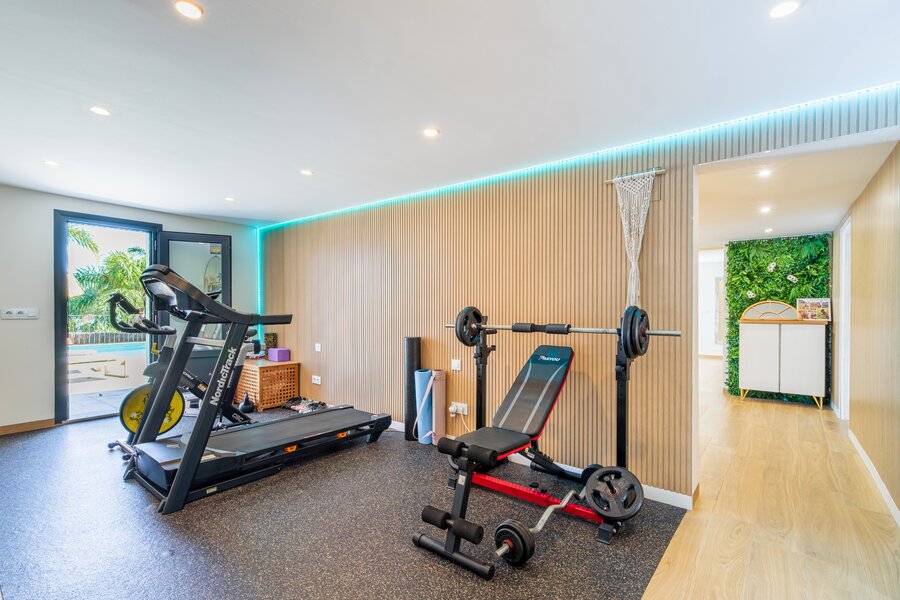 De benedenverdieping herbergt een volwaardig gastenappartement met salon, volledig uitgeruste keuken, slaapkamer en badkamer. Daarnaast is er een gym met eigen badkamer (die eenvoudig kan worden omgevormd tot een extra slaapkamer), een berging en een technische ruimte.