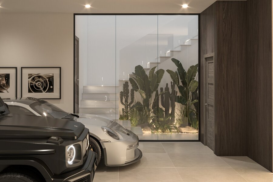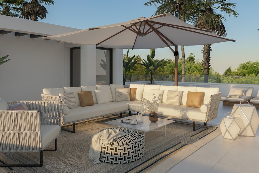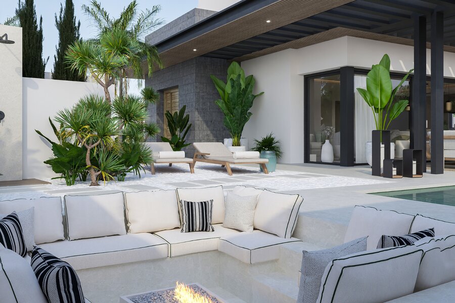 Het pand is goed verdeeld over 4 niveaus, een kelder, begane grond, eerste verdieping en dak met solarium. Het heeft een privézwembad en buitendouche. Aan de andere kant heeft de buitenruimte een overdekte eethoek, plus nog een terrasgedeelte voor banken en een chill-out gedeelte dat in deze villa ruimer is dan in de rest. De schaduwrijke en zonnige gebieden zijn goed gepland, allemaal omringd door een grote tuin. De villa wordt omringd door weelderig aangelegde tuinen en de kamers hebben grote ramen om natuurlijk licht binnen te laten en de schoonheid van de tuin een constant onderdeel van het huis te laten zijn.
