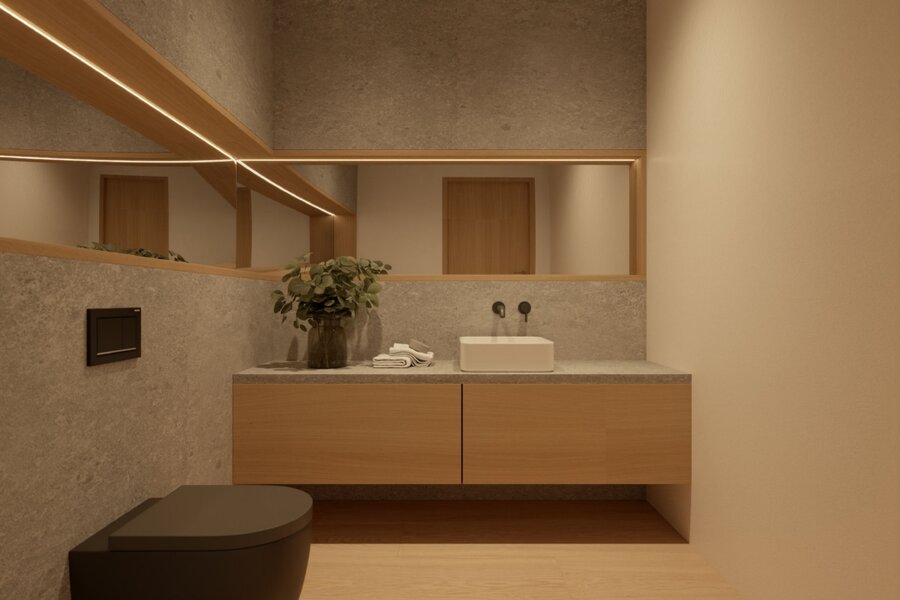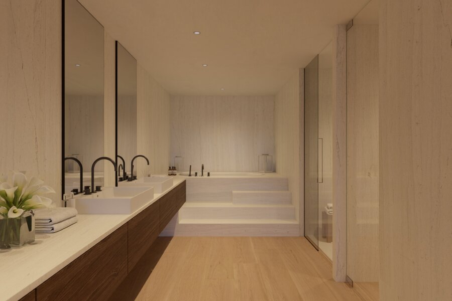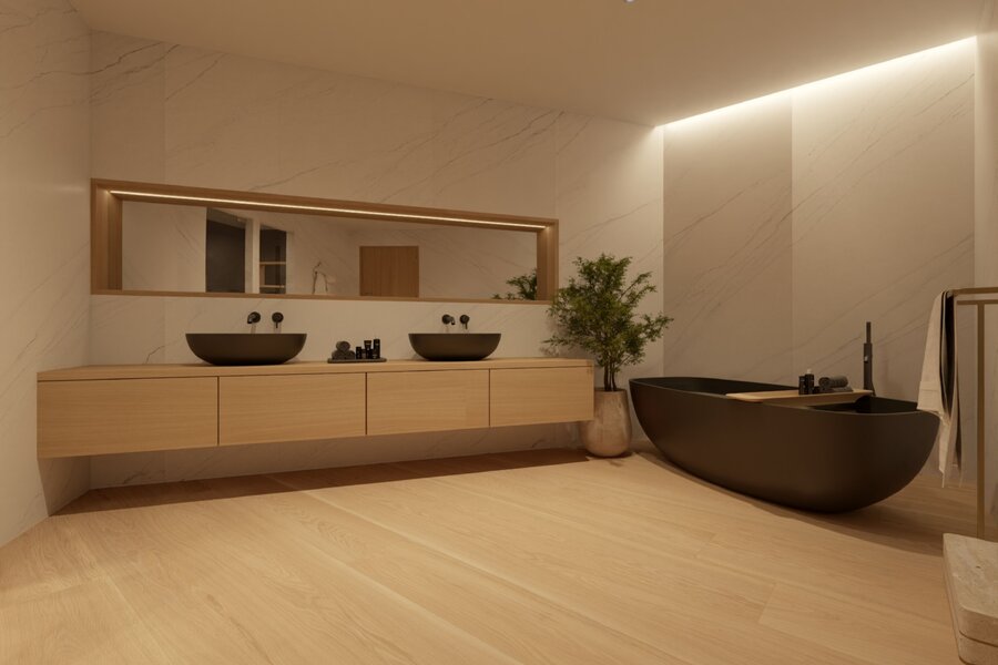 Het sanitair in de badkamers is van de firma Duravit, de kranen van Hansgrohe, de betegeling van het Italiaanse huis Trend en de werkvlakken van Corian®.