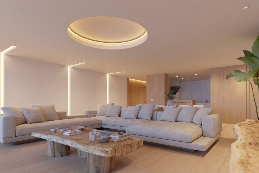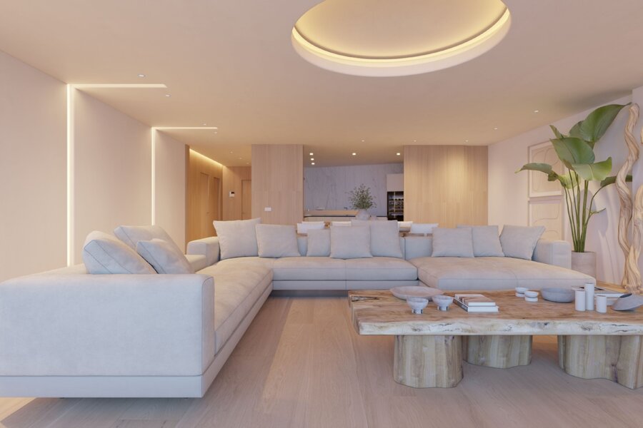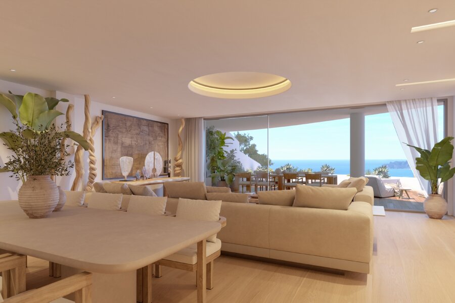 De blikvanger van het appartement is de woon-en eetkamer met een oppervlakte van meer dan 63m². Diverse ruimtes worden gecreëerd door de bijzondere verlichting en een schermprojector verandert de ruimte in een bioscoopzaal. Een leefkamer met veel lichtinval en directe toegang tot het grote terras met jaccuzi, overdekt terras en fantastisch zeezicht.