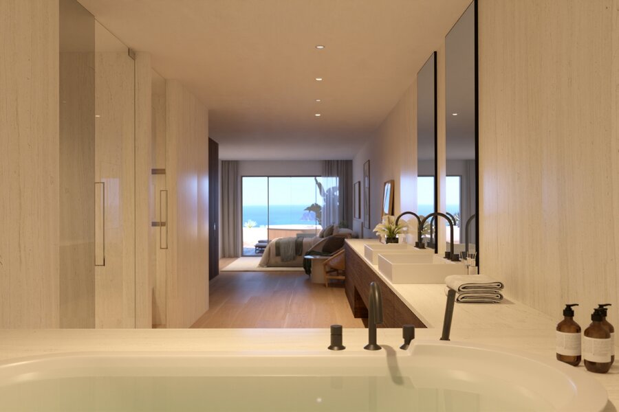 Het appartement heeft 3 slaapkamers, 2 badkamers met bad en douche voor exclusief gebruik en een toilet voor de bezoekers. De ”master” slaapkamer van ongeveer 51 m² heeft een grote en suite badkamer met douche en bad en een ruime dressing. De 3 slaapkamers hebben directe toegang tot het terras en bieden een fantastisch zeezicht.