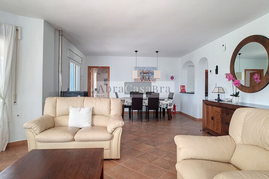 De ruime en heldere woonkamer heeft grote raampartijen met geïntegreerde luiken, er is een eetgedeelte en gezellige living die verwarmd worden in de winter met de pellet- en houtkachel.