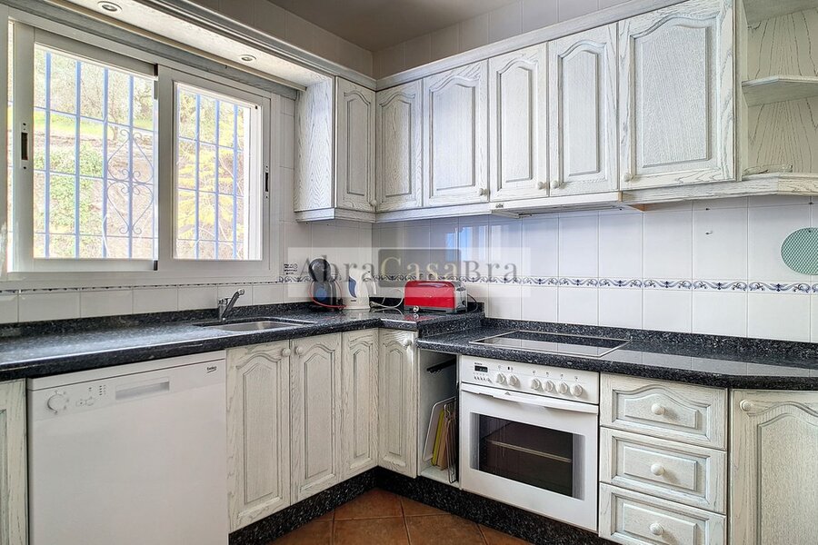 Via het terras kom je de gelijkvloerse woning binnen. De open keuken is volledig ingericht met elektrische kookplaat, oven, vaatwasser en granieten werkblad en grenst aan de bijkeuken.