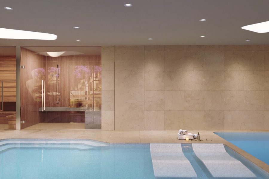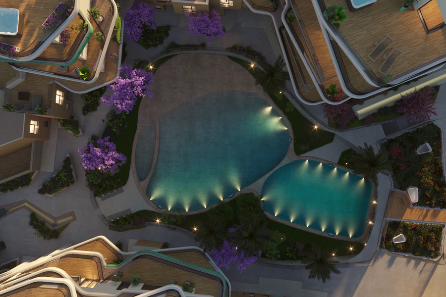 De gemeenschappelijke tuin bestaat uit grote groene zones met verscheidene gemeenschappelijke buitenzwembaden, een jacuzzi, wellness, fitness en een kinderzone.