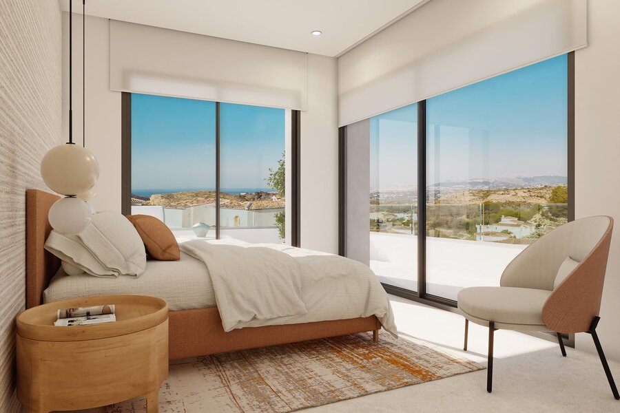 Op de bovenverdieping zijn twee ruime slaapkamers voorzien, elk met een eigen en-suite badkamer en toegang tot een groot privéterras. Deze terrassen zijn ideaal om in alle rust te genieten van het mediterrane klimaat en het indrukwekkende zeezicht.